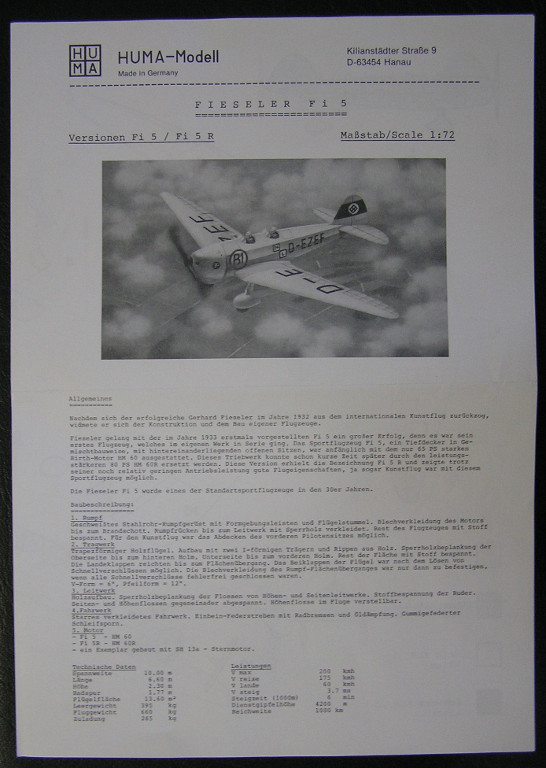 FieslerFi 5 R Sportflugzeug - ЛНД от HUMA-Modell (Bestell-Nr.2509) в масштабе 1/72