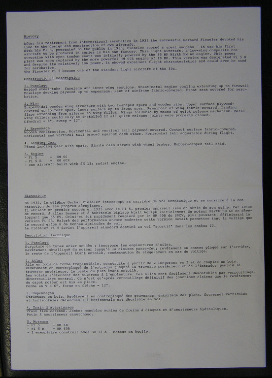 О прототипе: двухместный учебно-тренировочный и туристический самолет Fiesler 5 стал первым успешным проектом Герхарда Физелера (Gerhard Fieseler). Самолет представлял собой свободнонесущий низкоплан смешанной конструкции, с частично полотняной обшивкой. Хвостовое оперение - обычное расчалочное, шасси - трехопорное неубирающееся, с хвостовым костылем. Две кабины были оборудованы полностью дублированным управлением. Модель 5 R отличалась более мощной силовой установкой - рядным двигателем Hirth HM.60 R мощностью 80 л.с., против 60 л.с. у предшественника. В период с февраля 1933 до середины 1935 года было произведено 51 экземпляр самолета. Информация о прототипе в “нете” очень скудная.