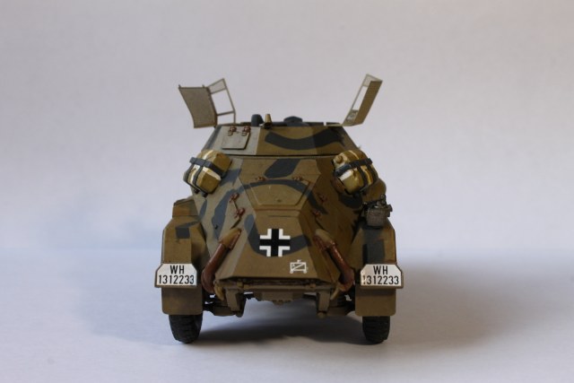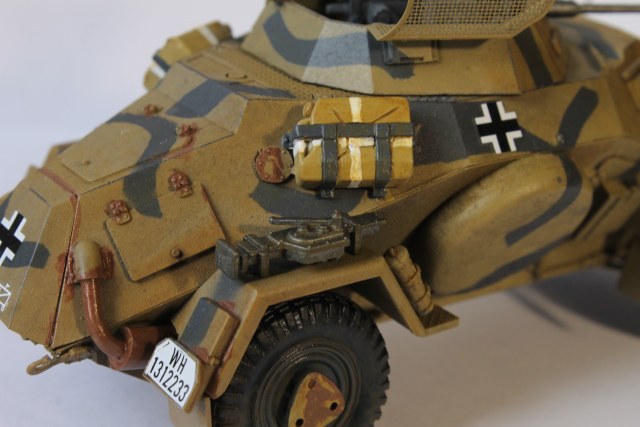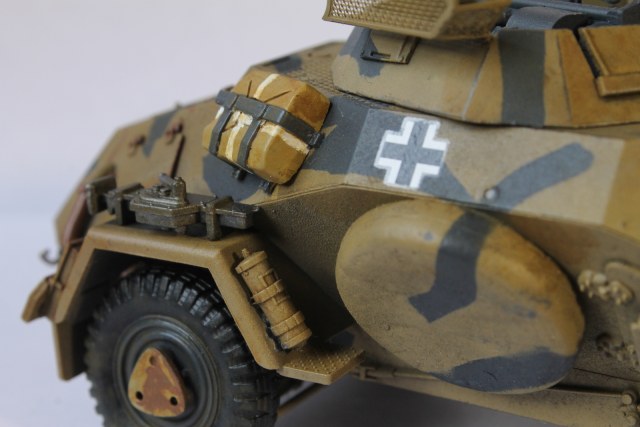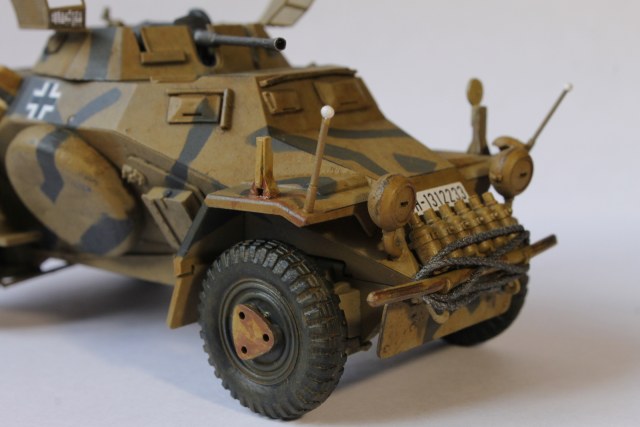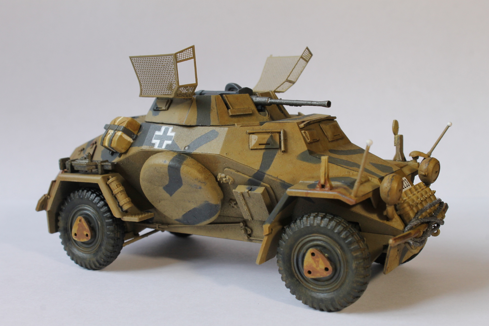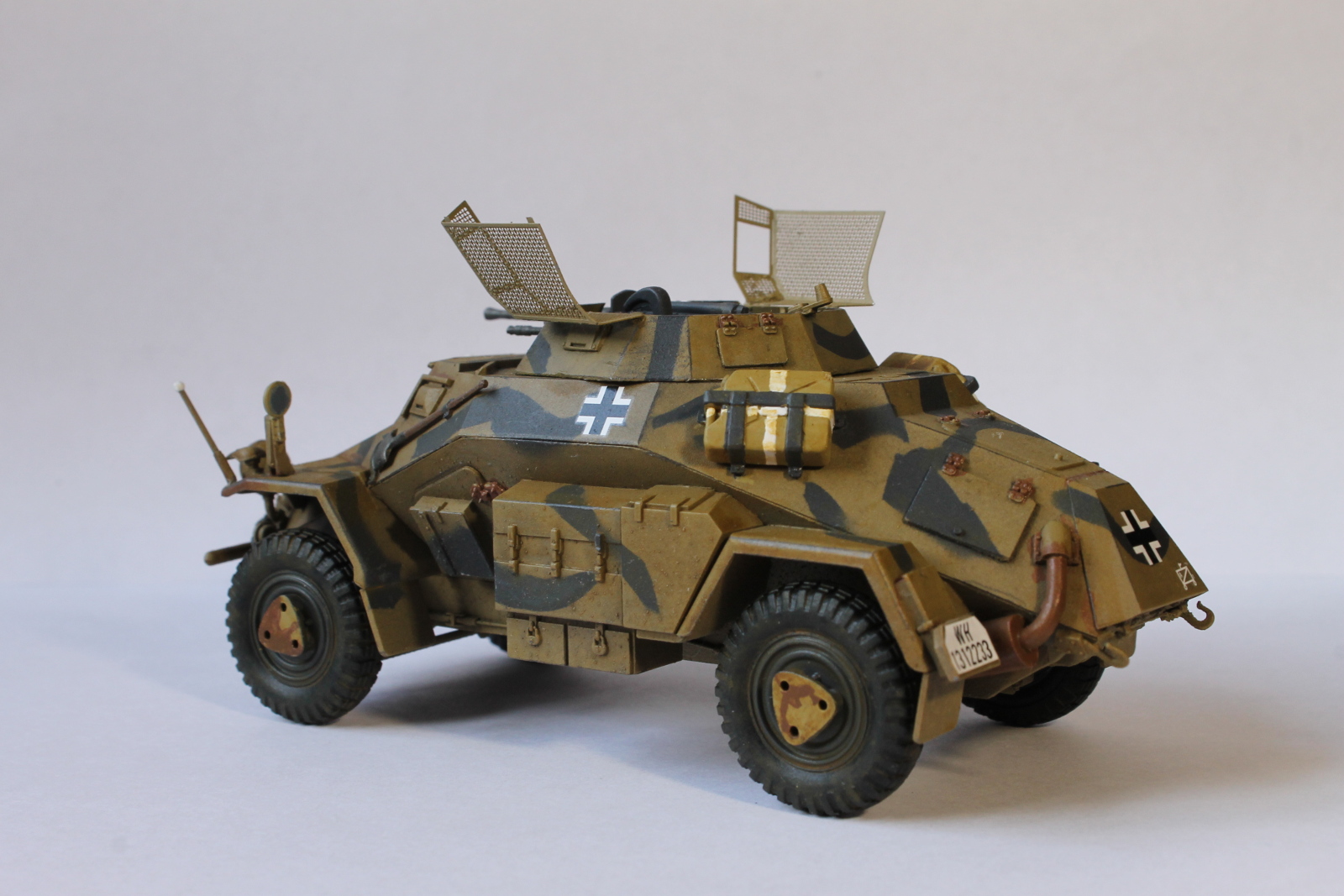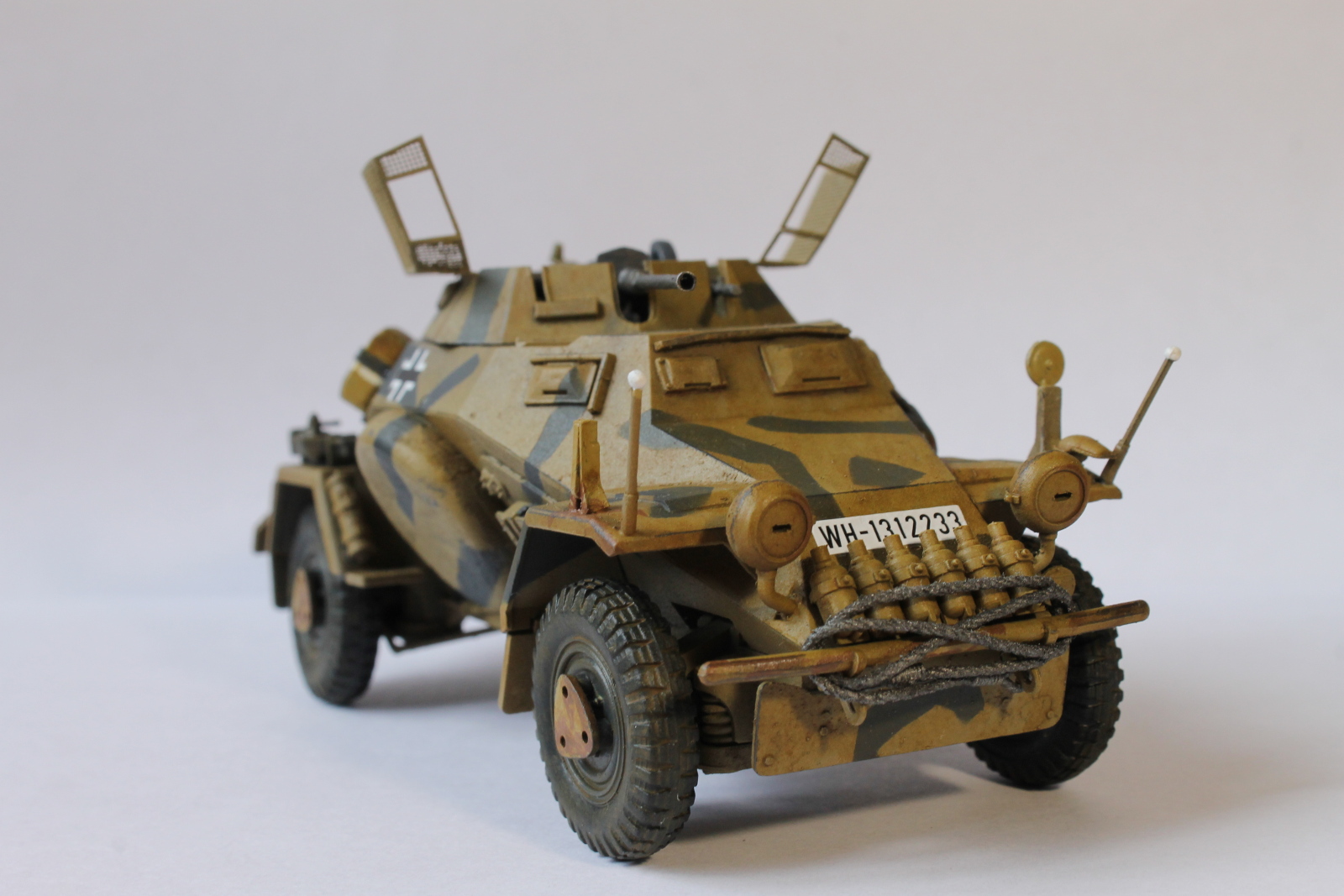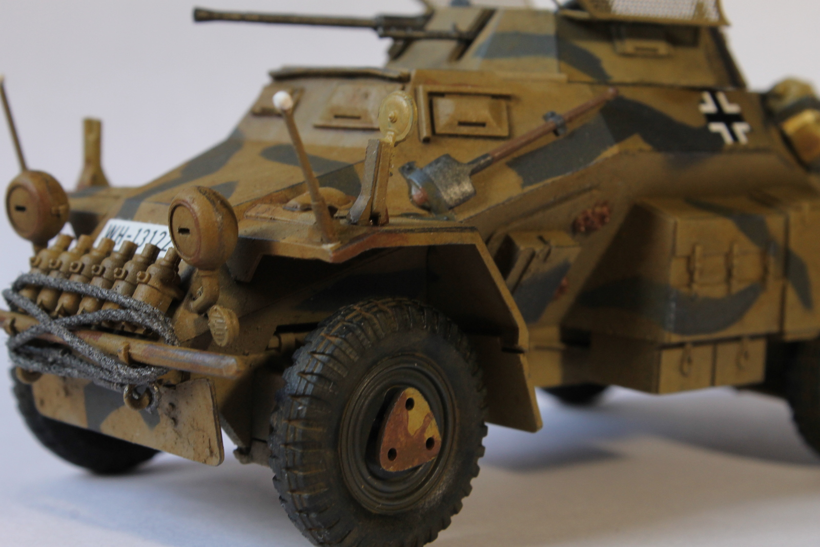 Для второй модели - весьма неплохо. Недостатки, конечно, есть. Смывка ржавчиной слишком контрастна, ее нужно больше растушевывать, а то похоже на следы от спринцевания масленкой. Чехол запасного колеса - брезент, его надо красить в брезент, а не в основной камуфляж. Орудие вращается вместе с башней, там на погоне штырек есть - как у вас на некоторых фото пушка повернута независимо от башни, быть не могло. Камок не совсем понятен - это Африка? Надо с большим вниманием относиться к мелочевке - замкам (цвет металла). Деки серебрятся - приварите уксусом. Лучше переместить модель в песочницу.