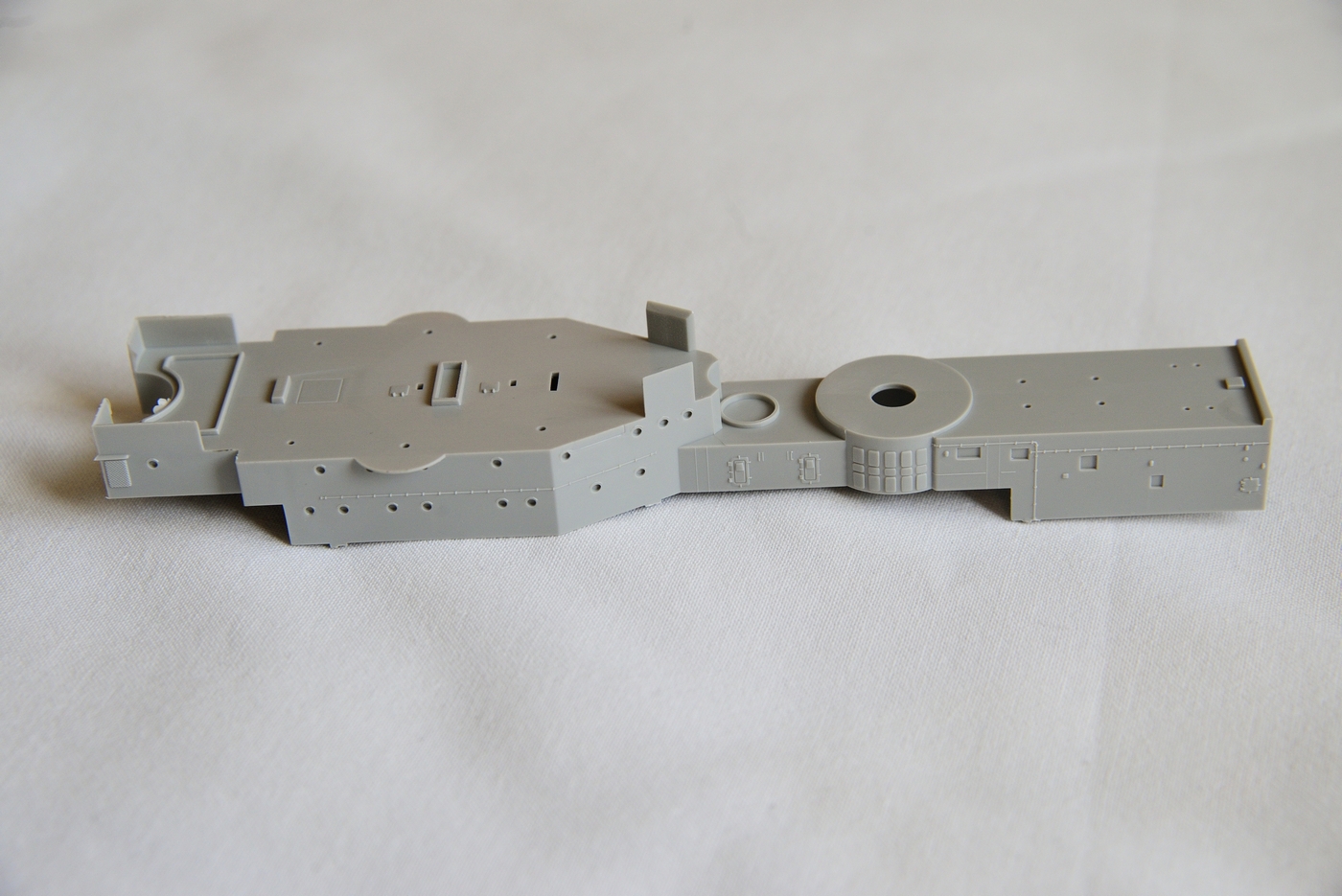 Корпус представлен единой деталью, имитации листов обшивки нет, иллюминаторы с козырьками выполнены аккуратно, утяжин шагрени и других дефектов литья нет,хотя в месте выхода гребных валов имеются едва заметные углубления.