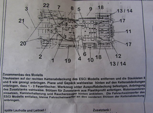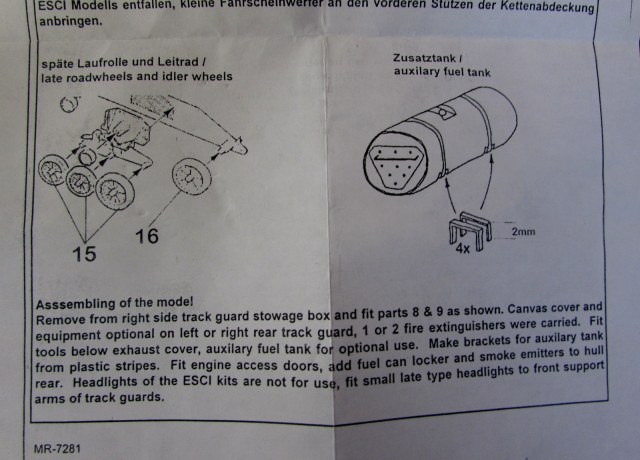 Итак, модель. Упакована в прозрачный пакетик. Внутри - этикетка, инструкция (а точнее, список деталей на английском и немецком, и рисунок машины "вид сверху" с указателями, куда чего пихать, - что, безусловно, поможет в нелегком деле сборки), и пакетик с деталями конверсии.