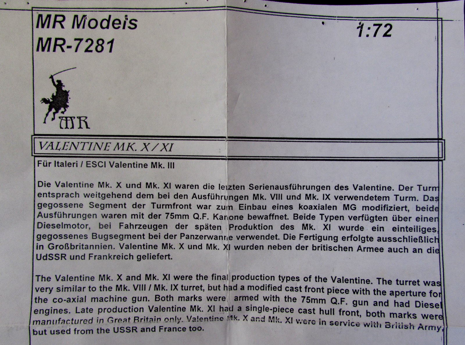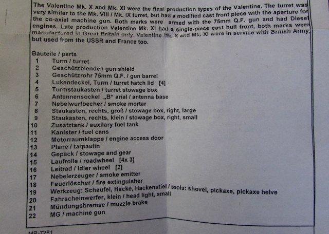 Как известно всем любителям 72-го масштаба, и так довольно убогий по нынешним меркам набор "Valentine Mk. I" вообще практически не встречается ныне на просторах России. Зато гораздо менее популярная вещь - САУ "Бишоп" - встречается почти повсеместно. Естественно, что в случае с танком многие моделисты предпочитают делать машину, поставленную в СССР (поскольку именно в СССР боевая карьера этого танка оказалась самой выдающейся и самой продолжительной). Также естественно, что заполучив в коллекцию эту САУ, многие начинают задумываться и о самом танке "Валентайн"; и если в случае с ранними модификациями машины еще можно разыскать модель от Esci/Italeri, то в случае с гораздо более поздними версиями сразу же встает большая проблема.