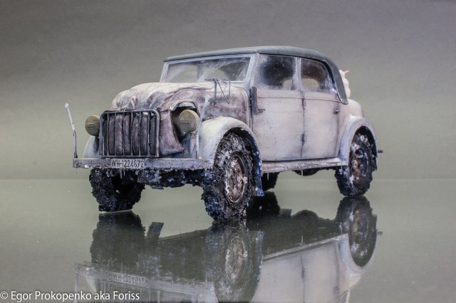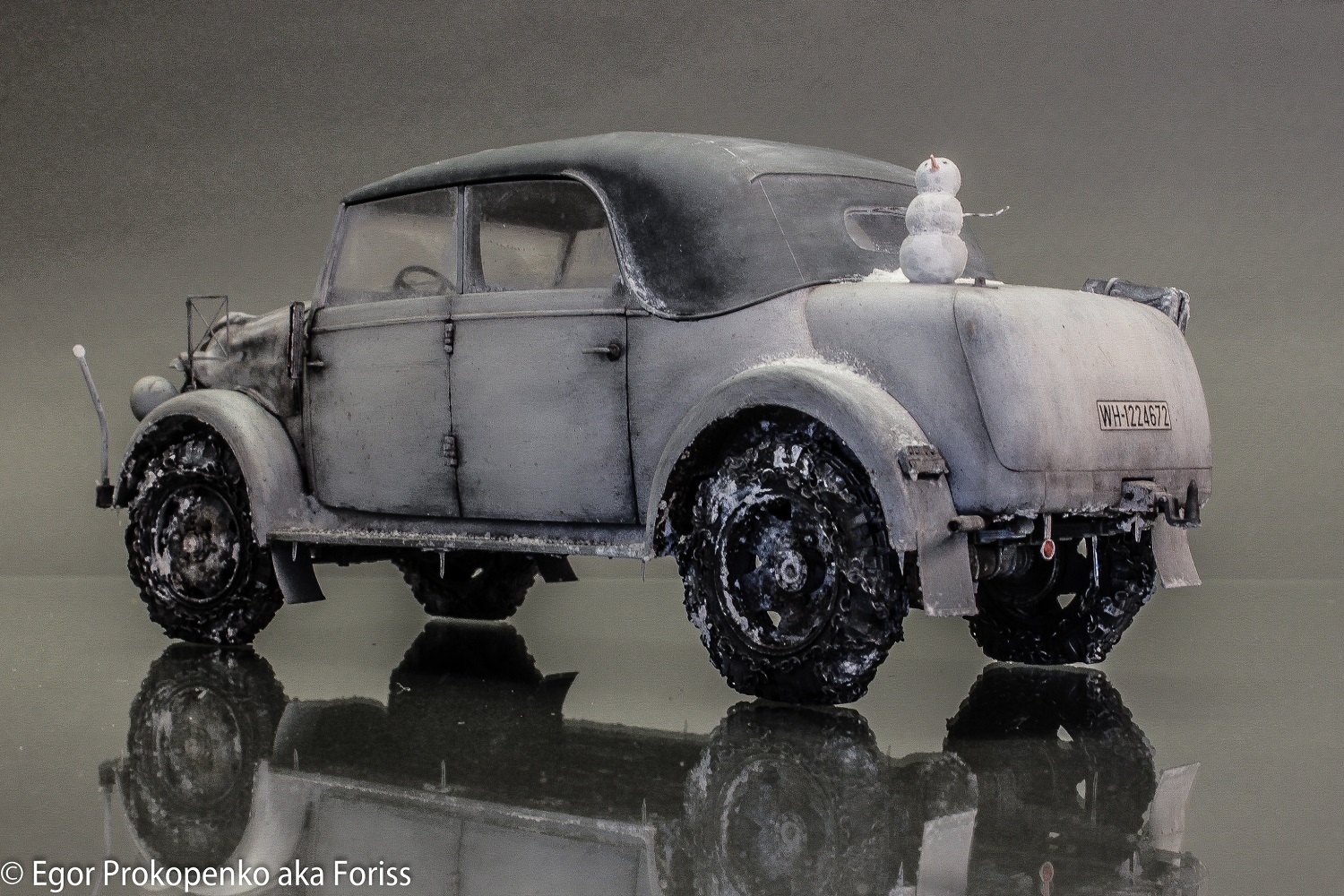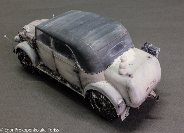 Само авто мне показалось несколько скучным, заезженным, уже в каких вариантах его только не делали: и африканском и сером и т.д., поэтому добавил смоленной капот с покрывалом, колеса с цепями, немного травленки из запасов. Готовую модель решил дополнить такой деталью, как снеговик, на мой взгляд, получилось «живенько»:)