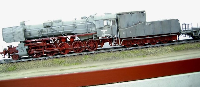 Существует много вариантов окраски немецких паровозов, но о таком никогда не слышал. Если паровоз военный, а это вроде как очевидно, то окрашен он должен быть полностью в серый цвет, либо в камуфляж (на ж/д он специфический). Если гражданский - то в черный с красной ходовой. Таких вот гибридов, на сколько я знаю, не было.