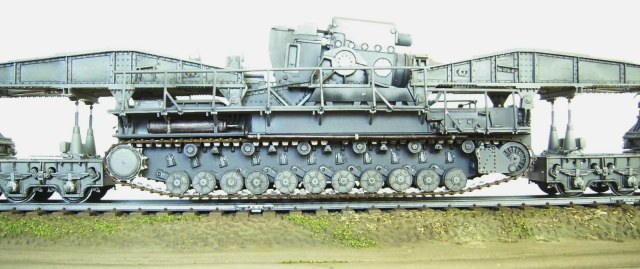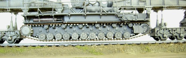 Я вижу провисание. Вопрос в другом - это как надо натянуть гусеницу, чтобы она, такая тяжелая, провисала так мало и не касалась рельсов? Потому и спросил о возможной системе фиксации при перевозке.
