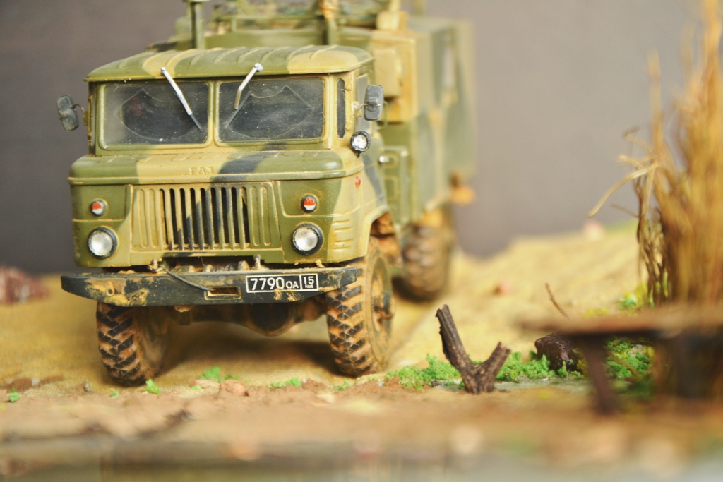 Доброго времени,коллеги. Буду краток, один хороший знакомый взял меня на "СЛАБО", раз самолеты собираешь и это сделаешь! Эта композиция готовилась в подарок знакомому моего знакомого, в общем Вы поняли. В итоге заказчик ходит с мокрыми штанами от радости, а я хотел бы услышать критику по первой своей в жизни диораме. Красилось все тамией и аканом. Небольшие доработки ( брызговики, задние габариты, номер задний, маскировочная сеть, трос лебетки, боковые повторители, в кабине огнетушители) Пачкал пигментами МИГ, сама основа из пеноплекса, песок взятый используется в пескоструйной машине на производстве, высохшая грязь - обычная глина с ПВА, вода - эпоксидная смола, и всякие камушки и веточки, заросли - обрезанный веник, мостик из палочек от мороженного, трава покупная. Сфотографировал на скорую руку, нет уже у меня этой диорамы, уехала. Пинайте!