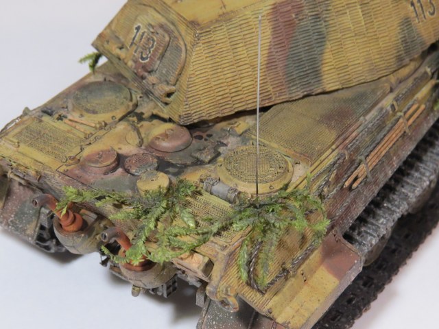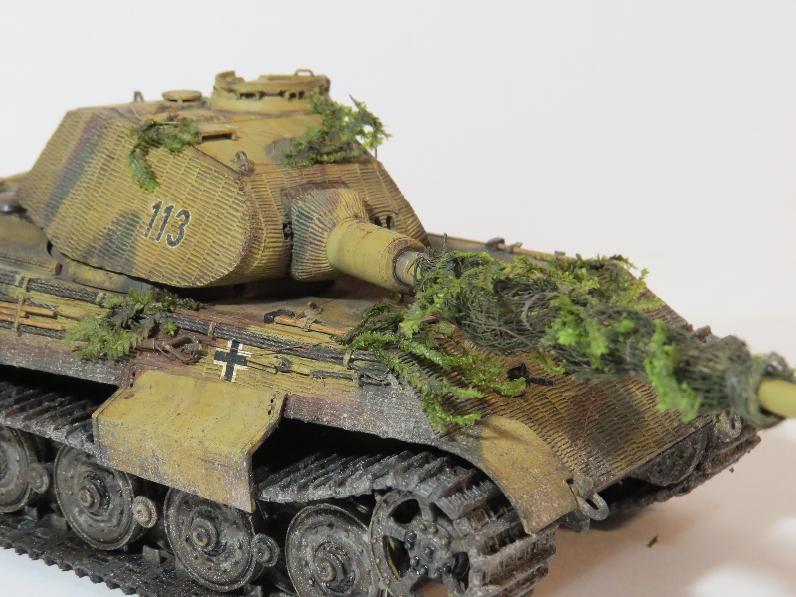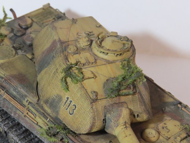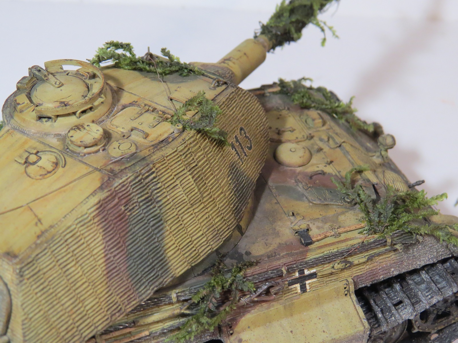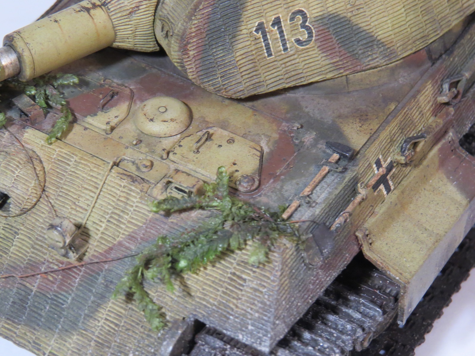 Красил я его акрилом Tamiya (базовый цвет-XF-60,камуфляж-XF-64,XF-61) ,фильтр видеровский,смывка от MIG,сколы сделал двухслойные первый слой - песочный,второй слой краска Vallejo(70822),ржавые потеки-миг,пигменты-Миг,Вилдер,беговая дорожка на траках натерта грифелем,натер пулеметы пигментом металлик(Миг).Копоть и нагар-пигмент сажа(Зип макет)Следы топлива- вилдеровский эффект.Чтобы не было так скучно решил закидать танк "еловыми ветками"(мох) и обмотал ствол маск.сетью.(марля).Так как у меня лютое освещение-фотографии иногда искажают истинный цвет,и эта модель не исключение:еловые ветки и ржавые патрубки в реале НЕ ТАКИЕ кислотные.