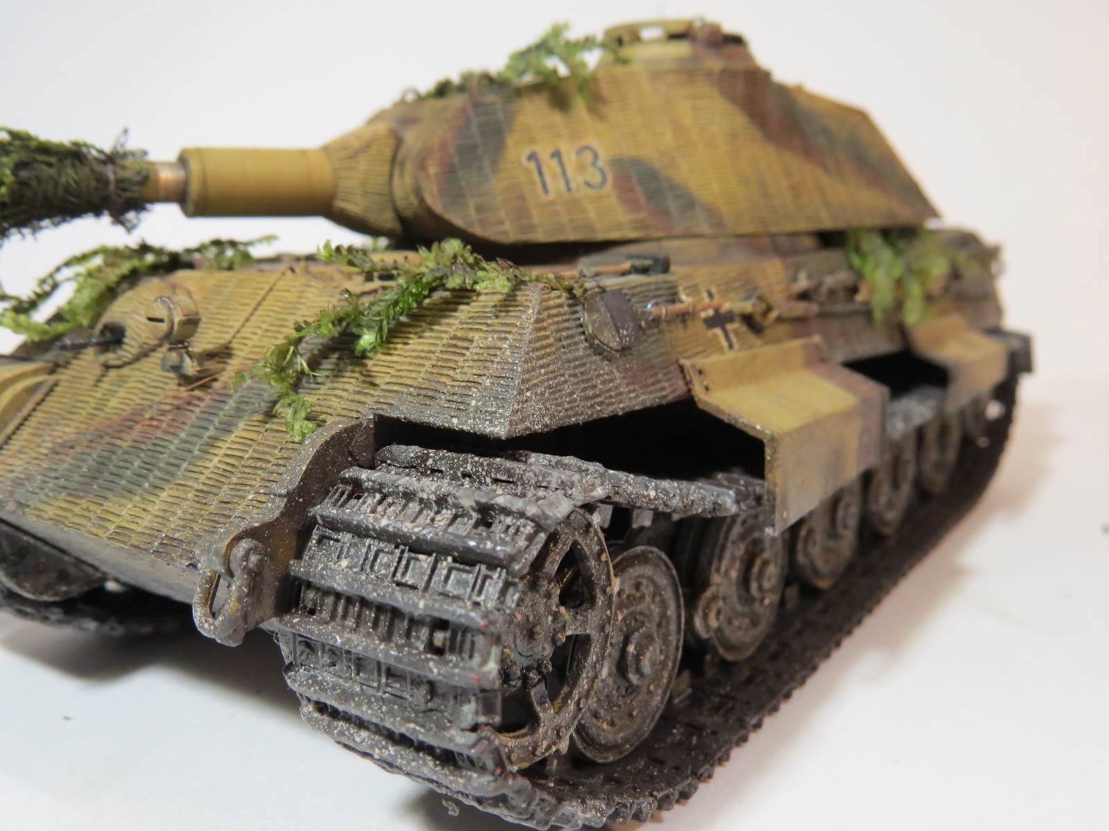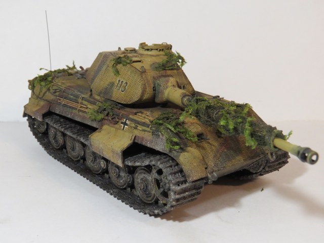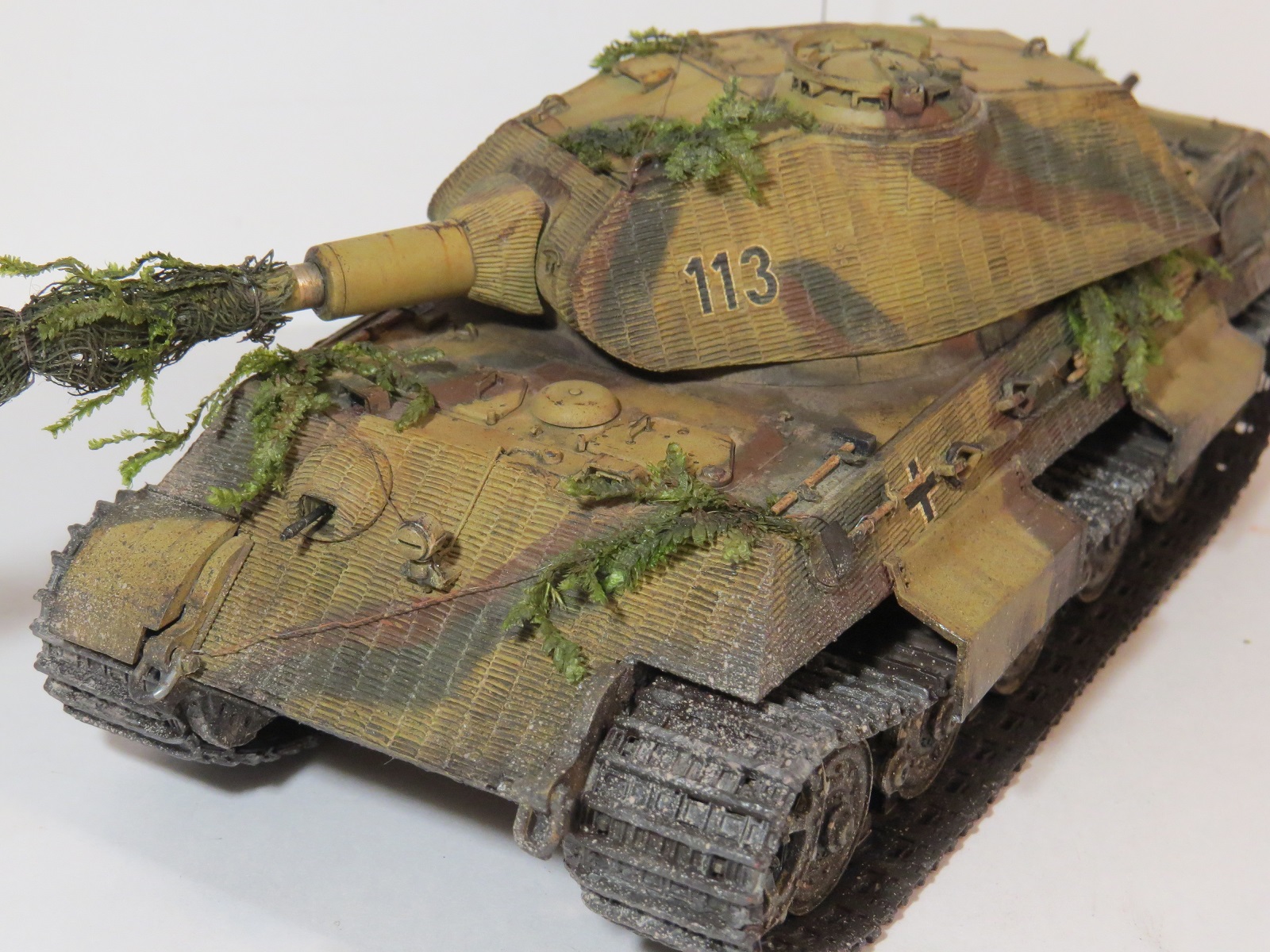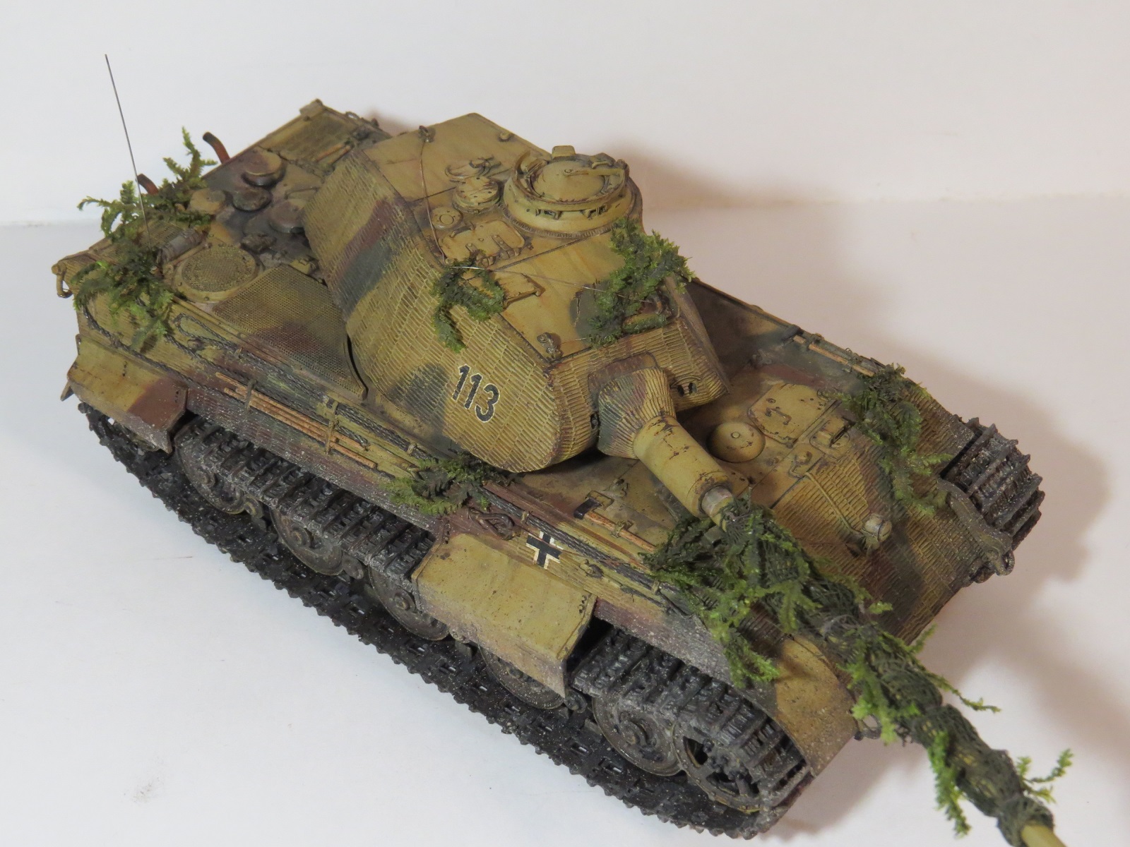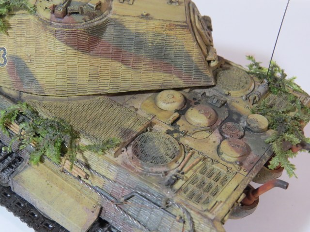 Красил я его акрилом Tamiya (базовый цвет-XF-60,камуфляж-XF-64,XF-61) ,фильтр видеровский,смывка от MIG,сколы сделал двухслойные первый слой - песочный,второй слой краска Vallejo(70822),ржавые потеки-миг,пигменты-Миг,Вилдер,беговая дорожка на траках натерта грифелем,натер пулеметы пигментом металлик(Миг).Копоть и нагар-пигмент сажа(Зип макет)Следы топлива- вилдеровский эффект.Чтобы не было так скучно решил закидать танк "еловыми ветками"(мох) и обмотал ствол маск.сетью.(марля).Так как у меня лютое освещение-фотографии иногда искажают истинный цвет,и эта модель не исключение:еловые ветки и ржавые патрубки в реале НЕ ТАКИЕ кислотные.