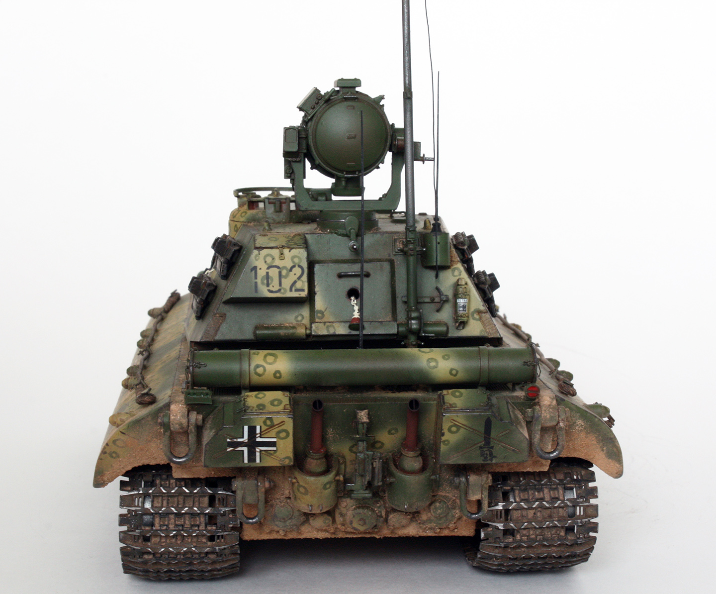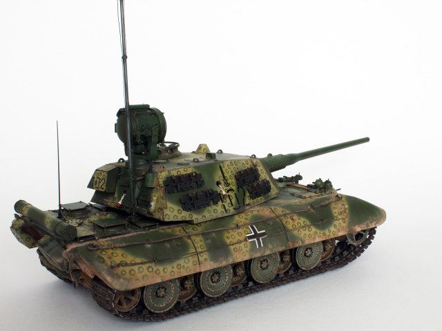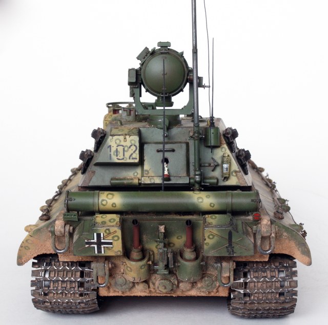 1.Машина получила комплект «противовоздушной брони» над отверстиями воздухозабора и шахтами вентиляторов. Над прямоугольными решётками воздухозабора установлены травлёные пластинки из набора Voyager для танка E-100, закреплённые смоляными болтами от MasterClub. Пластины над шахтами вентиляторов изготовлены из тонкого листового полистирола, и установлены на тонкие пластиковые прутки с приклеенной сверху имитацией болта и гайки, срезанные откуда-то с лишних деталей;
