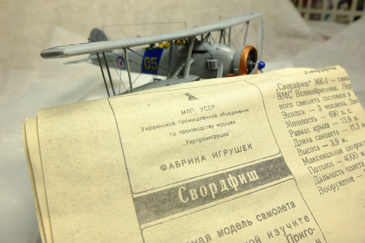 Разрешите выставить на ваш суд модель самолета Swordfish, которую сделал мой отец. В реальности он выглядел немного иначе, но из-за отсутствия декалей пришлось рисовать самому (через трафарет). Цифры аккуратно вырезать не получилось(результат не понравился), поэтому наклеил мою декаль. Модель была куплена по случаю за 100 рублей. В ней не хватало некоторых мелких деталей и декалей. Производитель: украинская фабрика игрушек еще времен СССР. Пластик стал жестким и хрупким от времени. Хорошо клеился только клеем от Mr.Hobby (Mr.Cemment). Стройка была немного сложной, отец иногда немного "огорчался", на в принципе победил легко. Я тоже внес свою лепту покрасив пилотов(не самым лучшим образом).