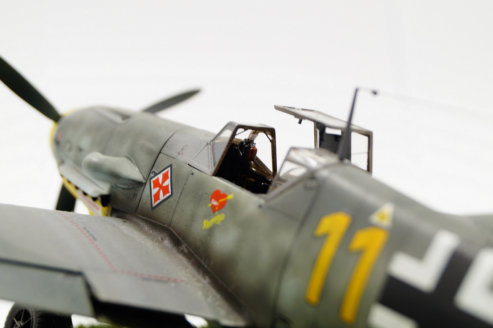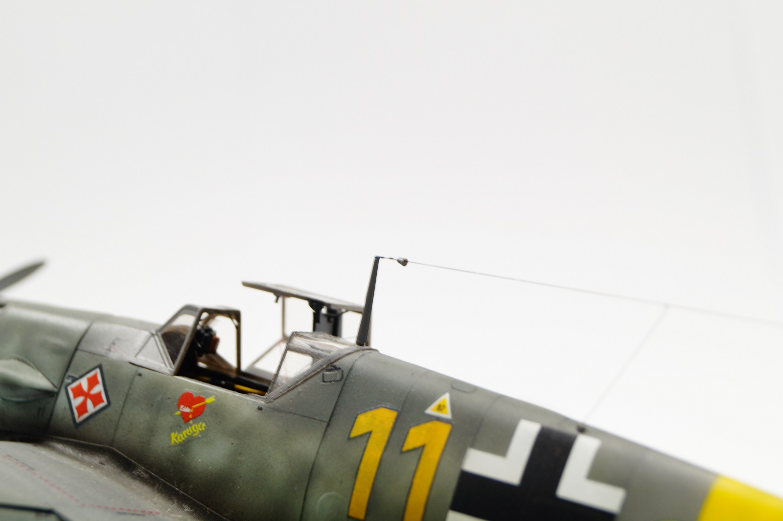 Всем доброго времени суток. Из-за нехватки времени работа растянулась почти на два месяца. Доработок и переделок хватало. Помимо Векторовского набора (стволы пулеметов, вых. патрубки, кок, элероны,ниши шасси), дорабатал фонарь, добавив ручки для форточки, красный индикатор на остеклении, ручка открывания, на лобовом добавил перемычки для усиления, помимо основных стоек шасси, добавил гидр. шланг и для хвостового (надо было толще сделать). Рассверлил отверстие под мотор-пушку на коке, горловину топливного бака с имитировал с помощью самоклеящей фольги, сделал канал для входа радиоантенны в фюзеляж.