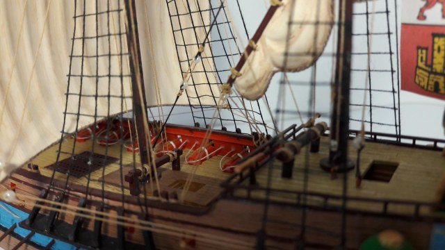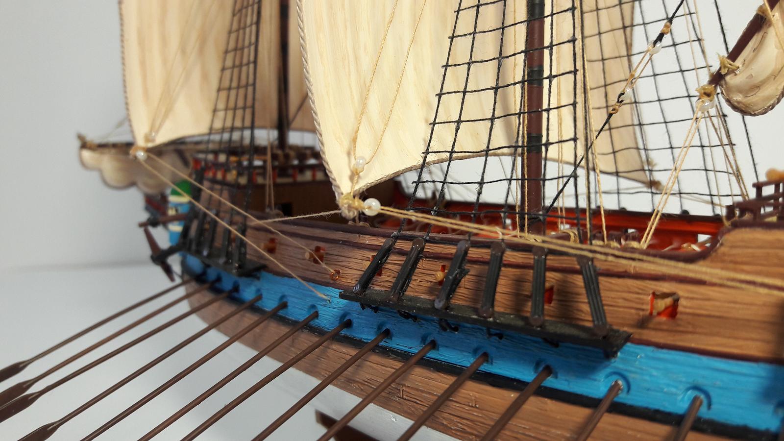 Сейчас уже понимаю, почему появились огрехи в покраске. Они отчетливо видны на фотографиях.О покраске бисера в коричневый тон думал. Возможно ее нужно было делать до установки на модель. Сейчас боюсь окрасить такелаж.Со всеми недостатками абсолютно согласен.