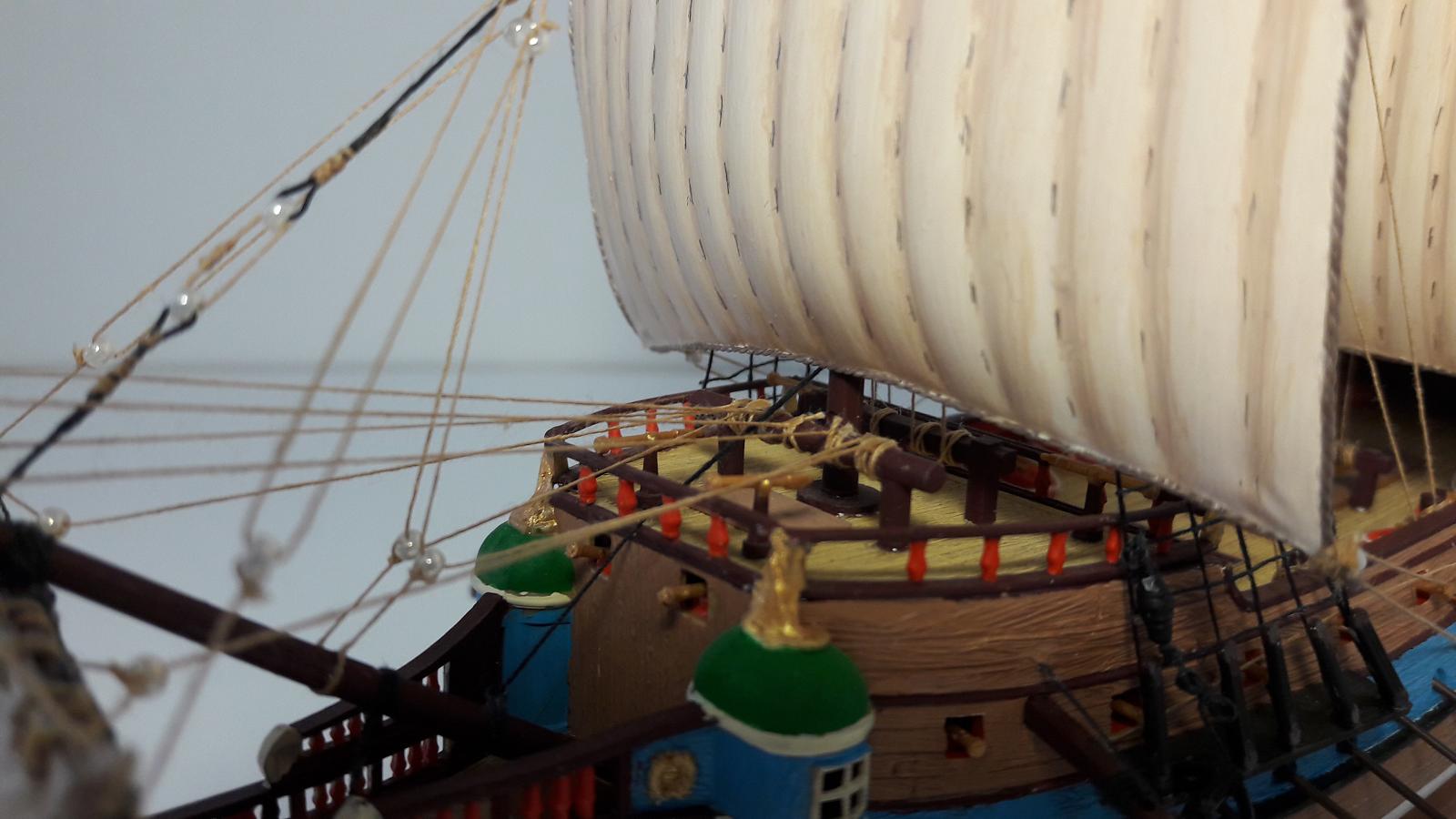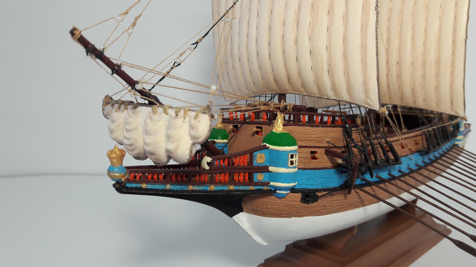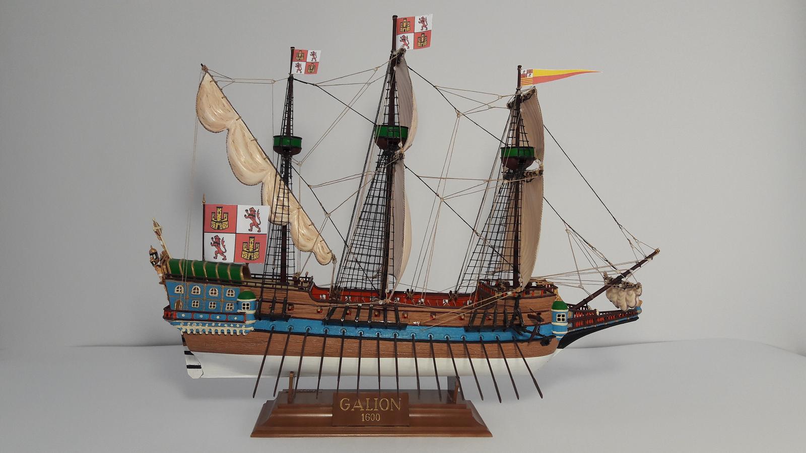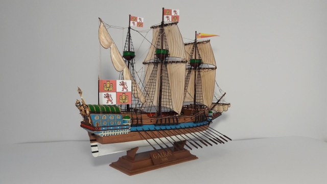 Цветовую схему в самом начале использовал из инструкции. Раскрасив пушки в красный цвет, как рекомендует инструкция, разместил их на палубе полез в интернет и понял, что нужно их как то закрепить. Кое- что для этого сделал. И потом в течение месяца я только и читал, занимаясь самообразованием о постройке. Тут и появилось желание сделать больше, чем дает инструкция. Далее появились энциклопедия О.Курти «Постройка моделей судов», переводы книг В. Монфельда «Модели исторических кораблей» и Л.Петерсона «Такелаж моделей исторических кораблей» Андреем Баитовым. Пользуясь этими произведениями были доработаны якорное устройство, бегучий и стоячий такелаж галеона. Однако масштаб модели 1:200 не дал реализовать все желания.
