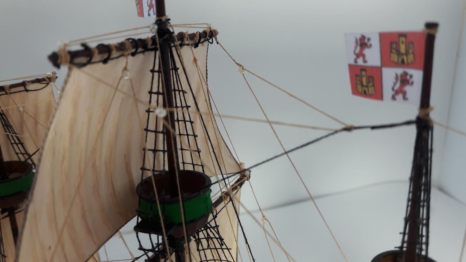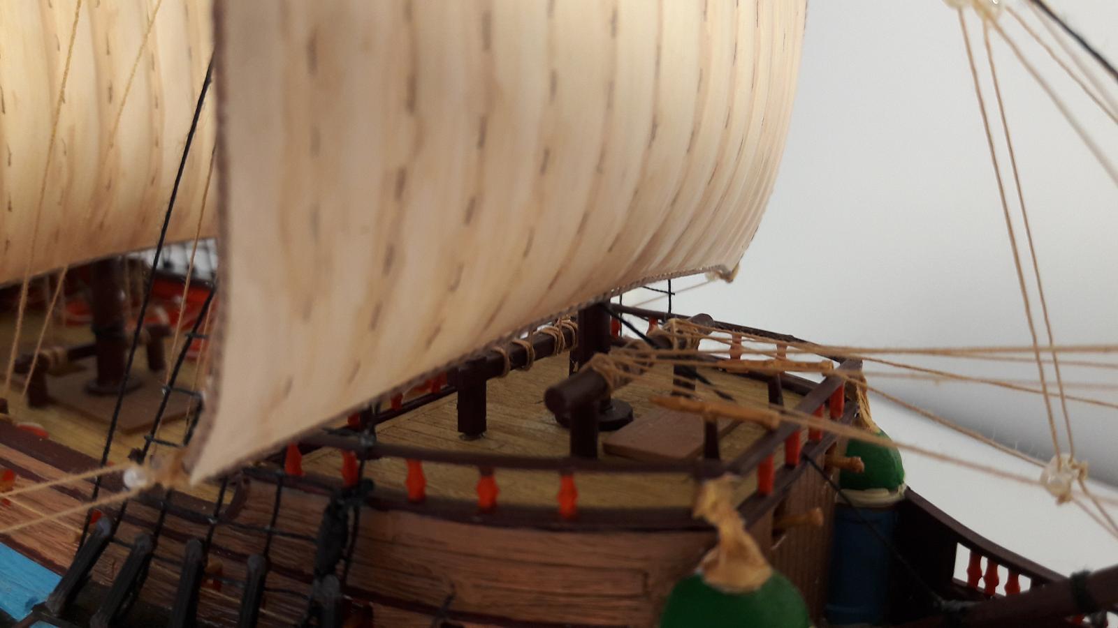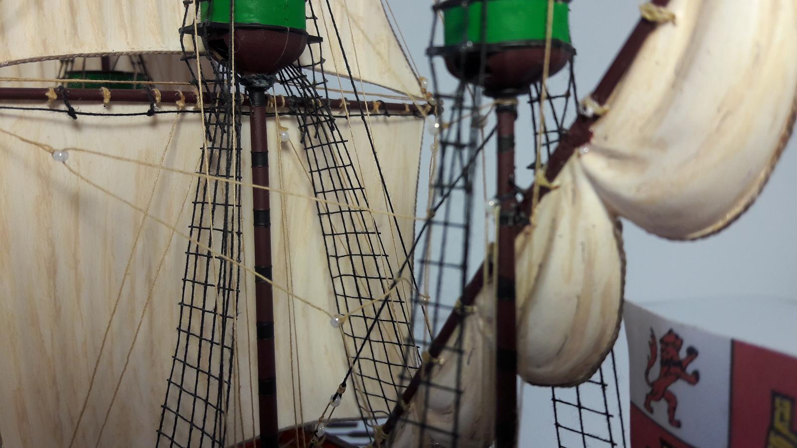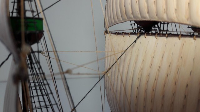 Паруса на первой своей модели решил оставить из набора, покрасив их с полутонами, мешая цвета краски. Установил на паруса ликтрос, на реи- перты. Добавил кофель-нагельные планки (их в наборе было всего две).