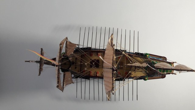 Очень даже не плохо для первой модели. Про матчасть не буду. А по окраске, вообщем-то смотрится красиво. Хотя есть отдельные нюансы и огрехи. Паруса хорошо получились. Хотя имитацию шва на этих парусах рисовать не надо было, а просто затонировать. Но все равно выглядит интересно.