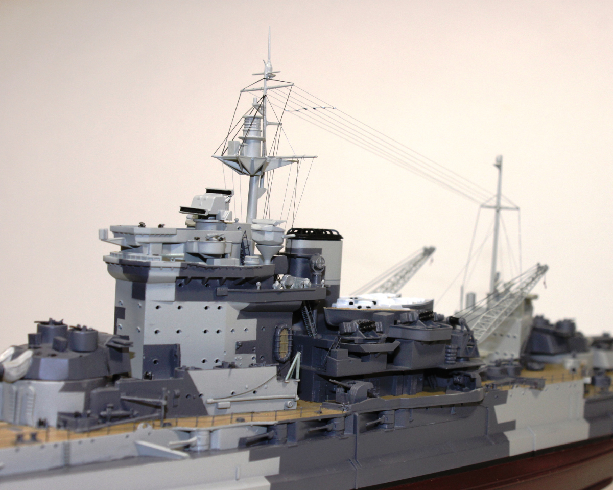 Под шлюпочной надстройкой (или как там она называется?) находился ангар гидросамолетов (на модели его двери отмечены горизонтальными воротами-жалюзями) . От ангара шли магистрали к поворотным кругам (типа железнодорожных) на рельсах катапульты. По ним на тележках гидросамолеты выезжали из ангаров. Делается это на модели легко, и достаточно ее украсит и сделает более копийной.