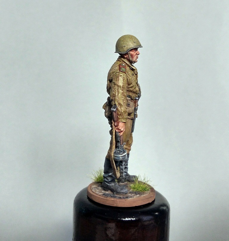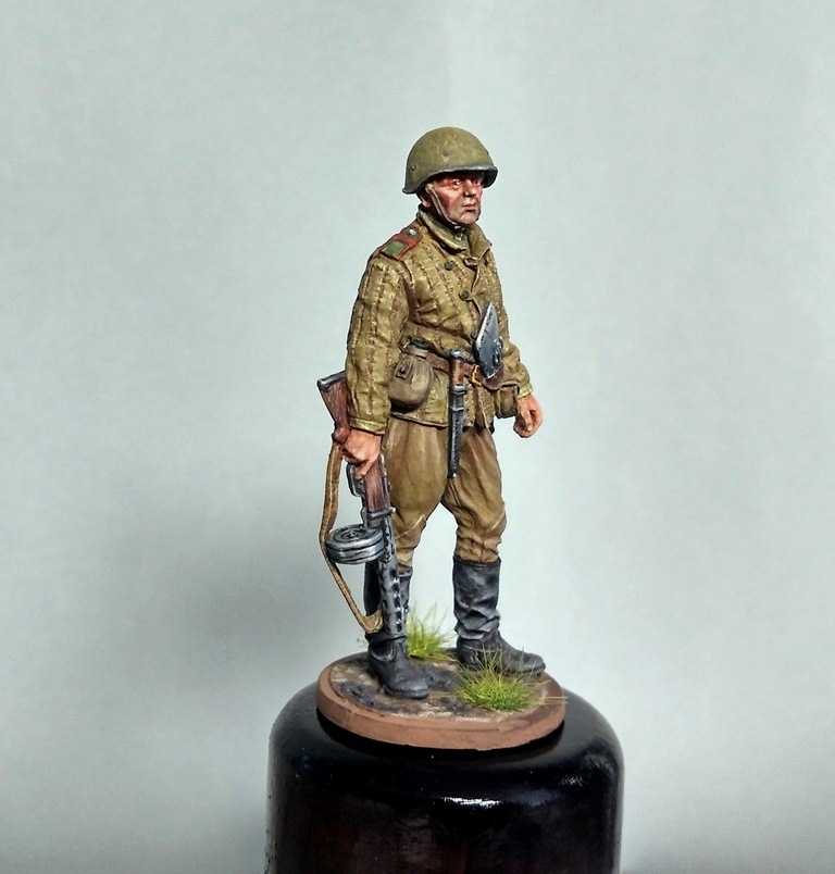 Фигурка на тему ВОВ от известного наверно всем производителя.Окраска производилась акриловыми красками валеха,звезда,тамия(основание). Впервые попробовал красить техникой "без металиков" металлические предметы, насколько удачно судить зрителям.А также сделал попытку организовать хоть какое то смотрибельное основание чтобы работа не выглядела недоделанной,хорошо что ЕК делает простенькое ,а то на подставку обычно у меня уже не хватает пороху.