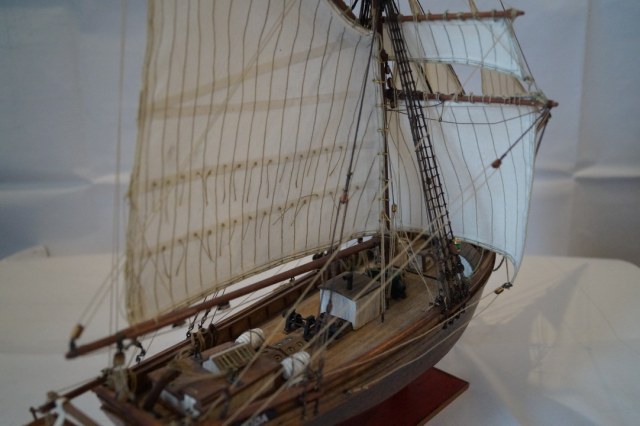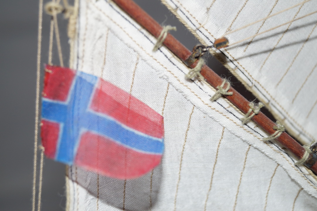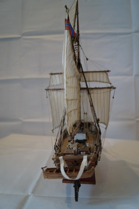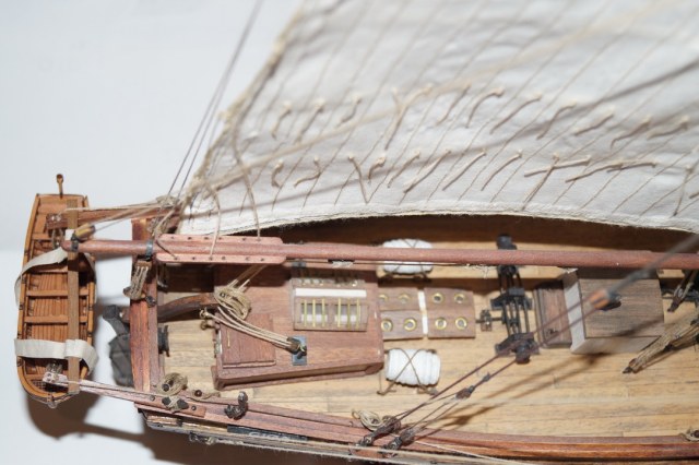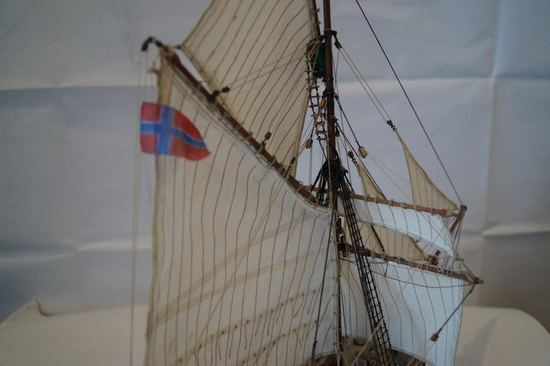 Силовой набор корпуса и палуба собирались легко, без каких-то сюрпризов. Производитель предлагает сделать одинарную обшивку (что несколько странно для такого масштаба), но было принято решение сделать чистовую обшивку шпоном сапели и рамина. Палубные надстройки, лебедки, брашпиль в наборе предлагается сделать слишком упрощенными и примитивными, поэтому брашпиль и лебедка сделаны с нуля по фотографиям из музея Осло. Палубные надстройки также несколько усложнены: сделаны нормальные двери, остекленение и обрешетка световых люков, добавлены цепные ящики, стойки для блоков румпеля. Для парусов в наборе дана ткань и выкройки, поэтому паруса были сшиты самостоятельно. Сама установка парусов и такелажа особых проблем не вызвала. Также были добавлены бортовые огни, труба на камбуз, флаг и шторм-трап в корзину на мачте. Отдельно была собрана шлюпка и установлена на кормовых шлюпбалках. Финишная отделка корпуса – масло и воск. Также в работе использовались обычные акриловые краски, спиртовые морилки под цвет ореха и дуба, матовый акриловый лак.