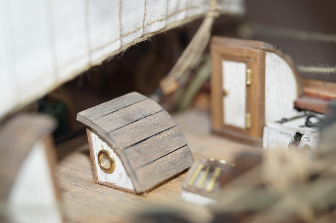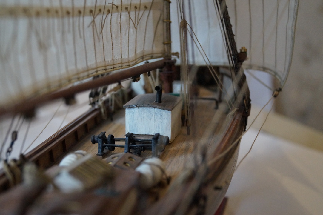 Кирилл, действительно, рубка за мачтой (камбуз) устанавливалась над грузовым люком во вермя плавания, как временная надстройка. Мне самому в процессе стройки показалась интересным такая конструкция (не сразу понял). Кстати, на фото из музея в Осло камбуза на палубе нет, и виден полностью грузовой люк.