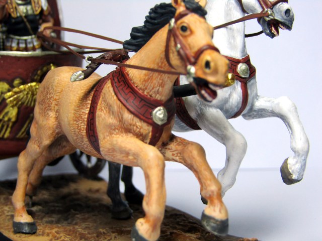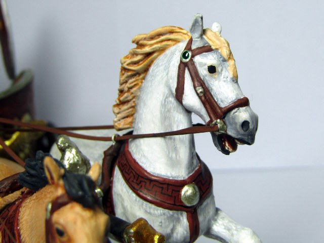 За попытку изобразить шкуру лошади отдельными волосками - респект. Вообще корпуса лошадей недурно получились. За переходы светотеней на самой колеснице - тоже плюс. Фрихенд на щите - достойно, очень достойно!