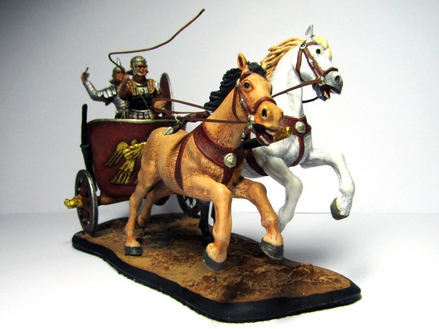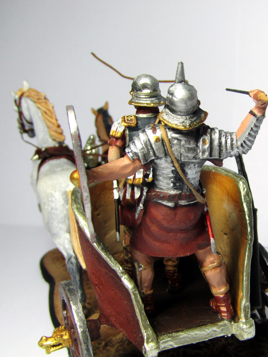 Боевые римские колесницы, да ещё времён 3-4 вв н.э.? Уж сколько Римом интересуюсь, а о таком никогда не слышал. А уж шлем имперского типа с рогом во лбу - это просто нечто. Да, скульптор от души повеселился. Пожалуй, где и могла быть такая колесница, так на соревнованиях, гонках. Скульптура, к слову, слабовата.