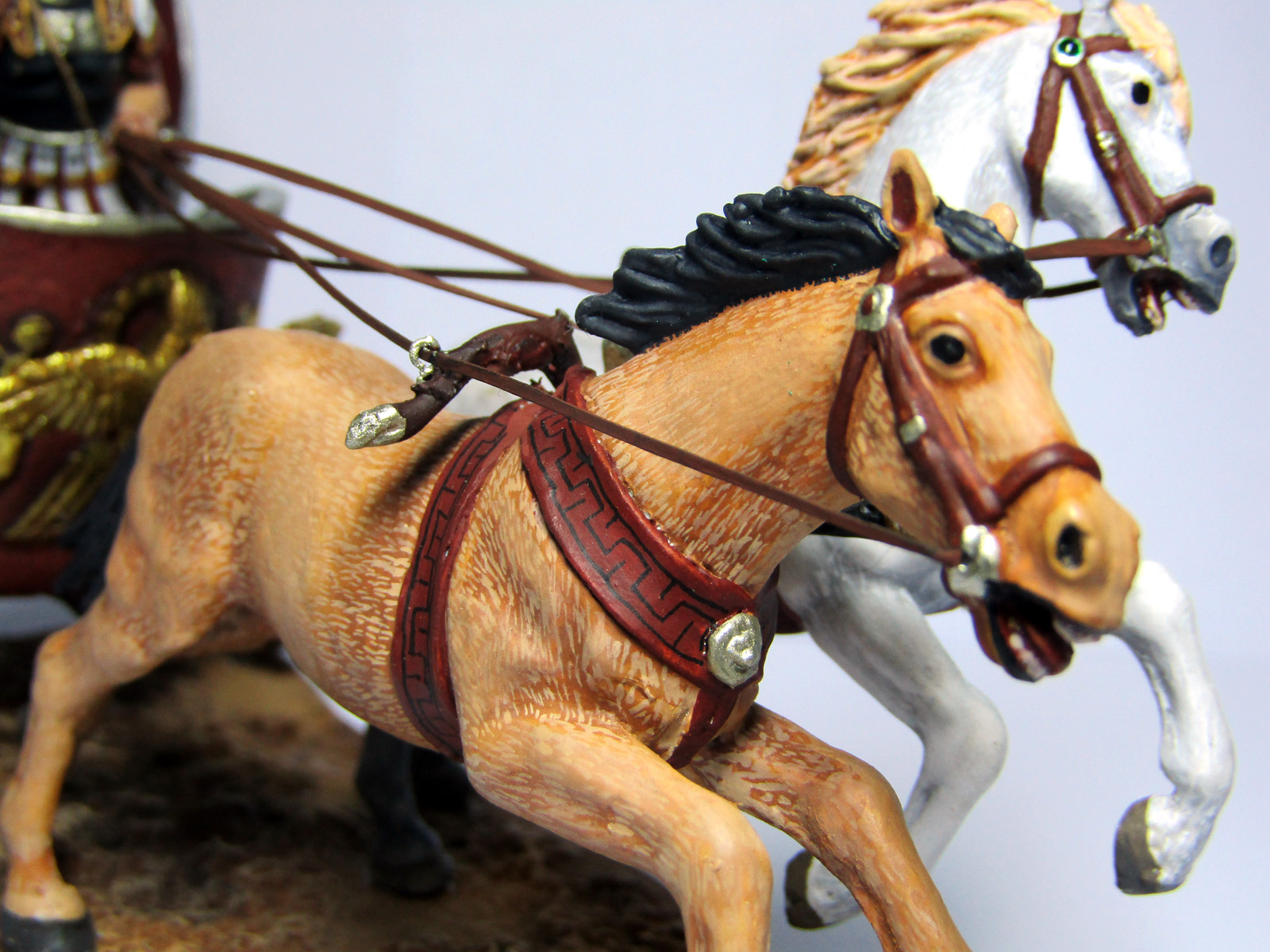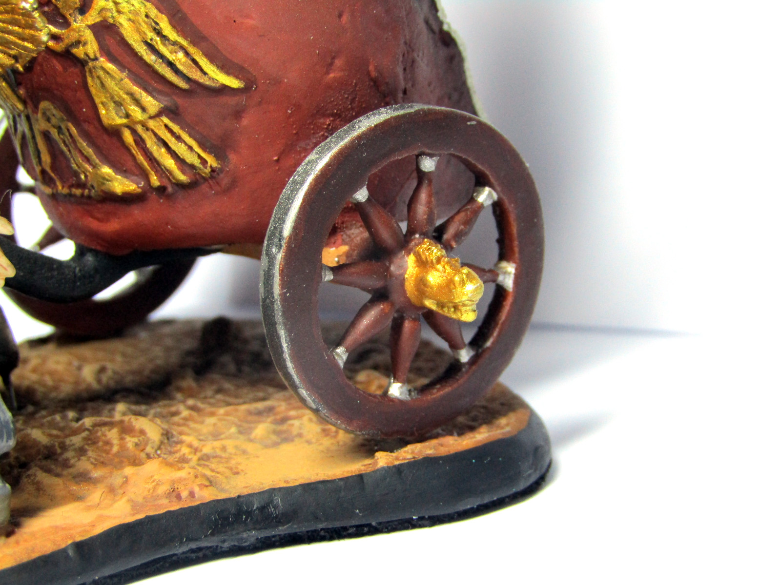 И еще - есть визуальное ощущение, что краска положена очень толстым слоем, бугрится. Особенно заметно на самой колеснице (хотя может и поверхность отливки неровная). Краска должна иметь консистенцию подкрашенной воды. Тогда она ляжет как нужно, пусть и за несколько проходов.