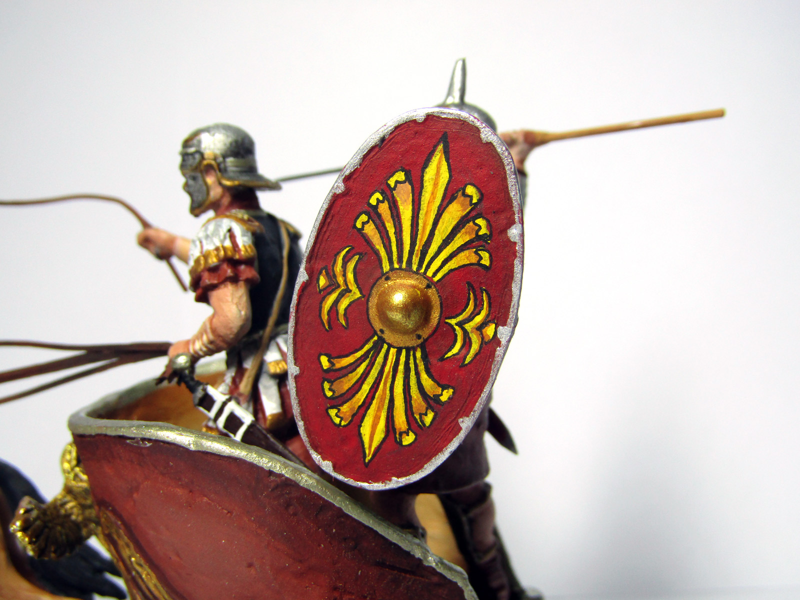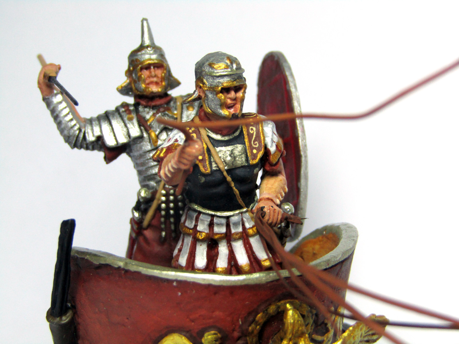 По аккуратности, увы, незачёт. Краска залазит на другие поверхности, например телесная перелезла на шлем, что хорошо видно уже на первом фото, красная краска с поверхности щита "цепляет" железную обивку. Доспехи неравномерно оттонированы, поверхности пластин доспеха недостаточно отделены друг от друга, кое-где углубления просто залито металликом, что не айс. Сбруя но лошадях тоже покрашена небрежно, краска с нее перелазит на тела лошадей. Если на отливке границы между поверхностями смазаны-замылены, что часто бывает, следует острым ножом или иголкой подчеркнуть эти границы. И рисовать станет легче и меньше вероятности что краска будет перетекать на другие поверхности.
