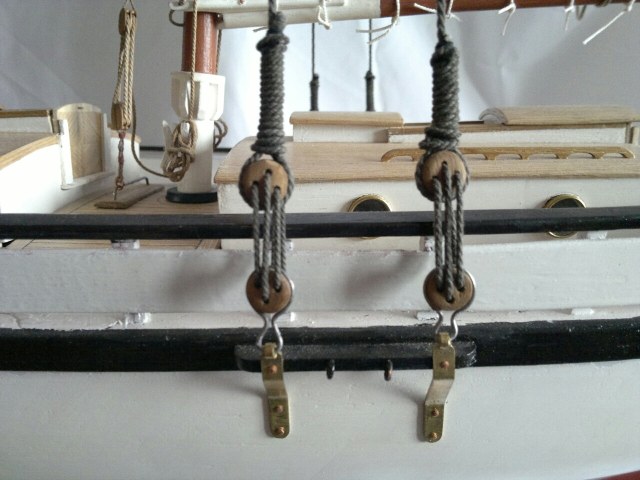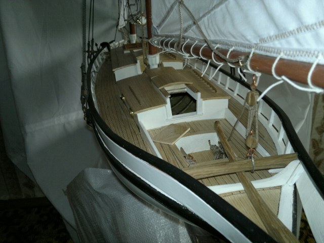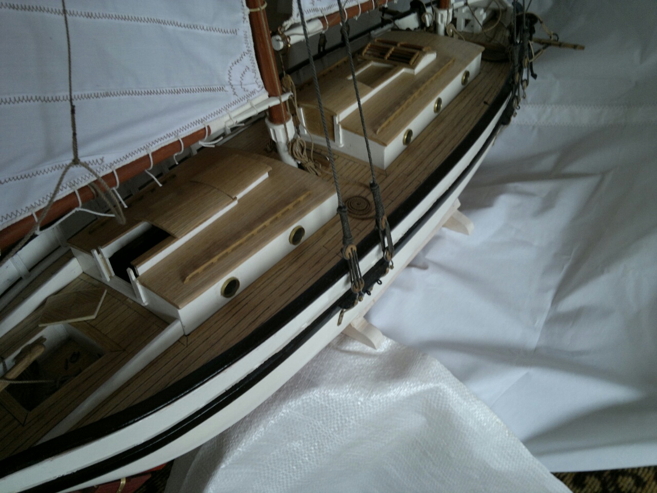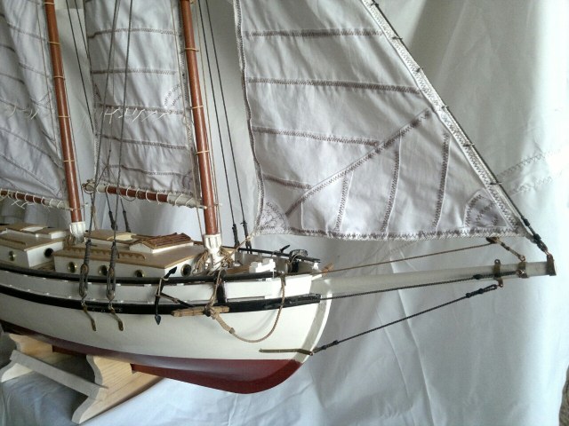 ИМХО - Стоило бы подтемнить (подкрасить латунь и медь). На бейфуте гика нужны ракс-клоты (для хорошего скольжения вдоль мачтового дерева) Там же, на бейфуте как-то неестественно торчат хвостики ревантов. Наверное стоило их провесить естественным образом и наверное сделать покороче... По имеющимся фото не разглядел проводку шкотов и вид парусов. Подожду пока с оценками, - может Автор улучшит и добавит фото?