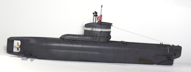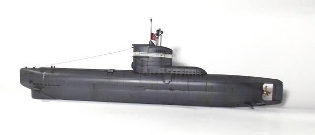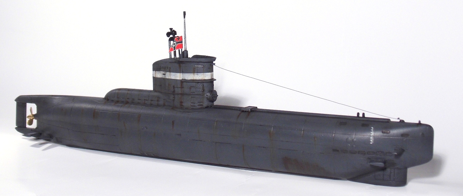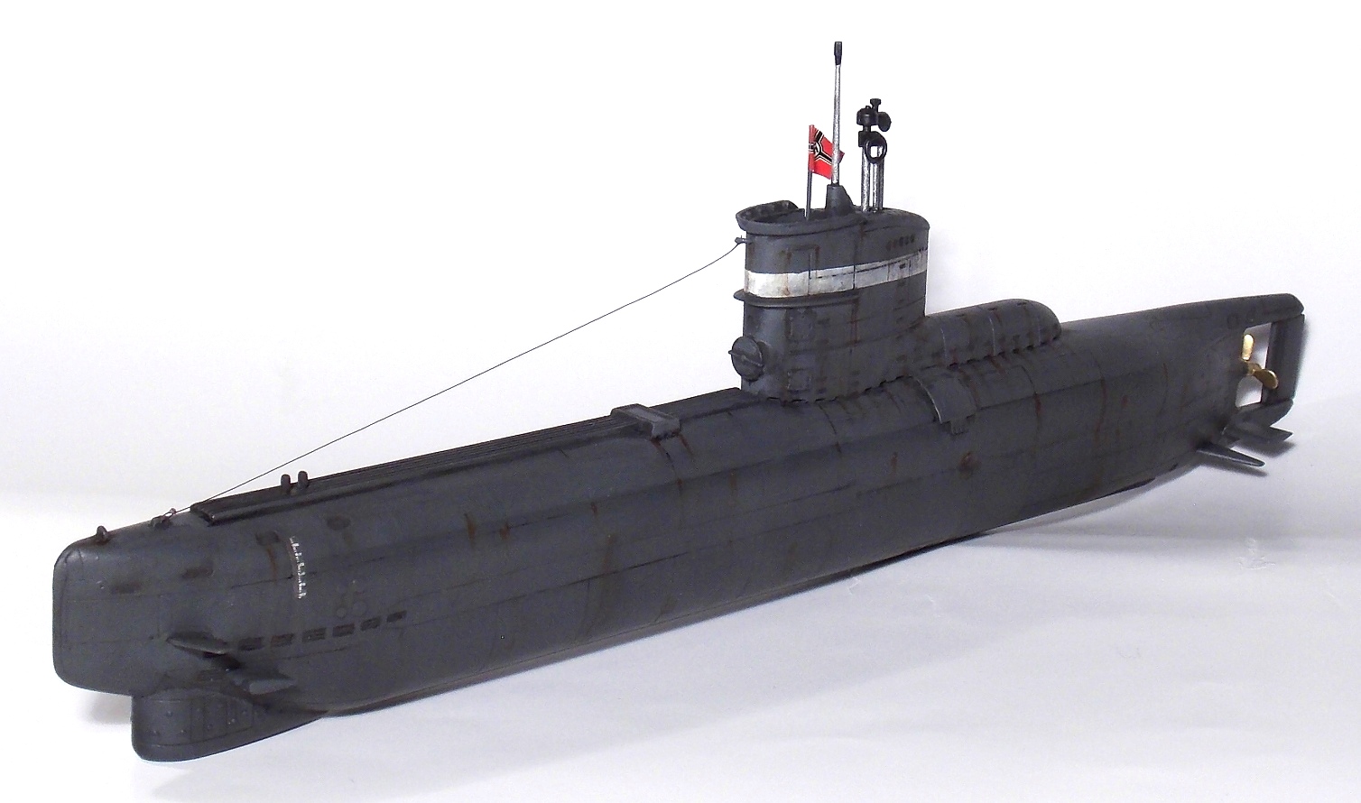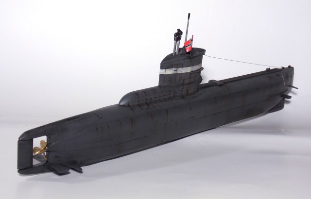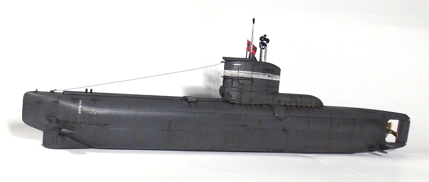 В морскую тематику случайно меня занесло. Я больше по БТТ специализируюсь. Сын Макс, 8 лет, попросил купить ему какую-нибудь модель, чтобы собрать её самому.Выбрать тоже сам захотел. В магазине понравилась коробка с подводной лодкой. Собирал он, конечно, не всё сам, я помогал. Красили тоже вместе, аэрографом сын управлял, я советовал и помогал. Ну, а тонировку, смывку, всякие потеки это уже я дорабатывал. В общем, прошу строго не судить, тема не совсем знакомая.