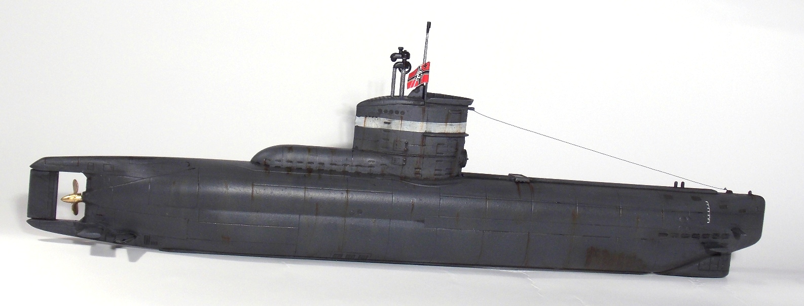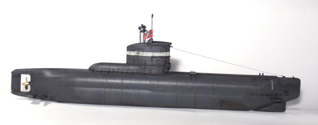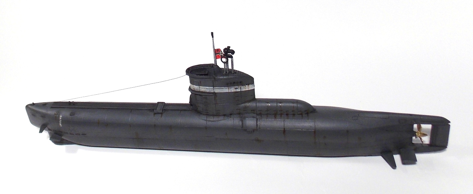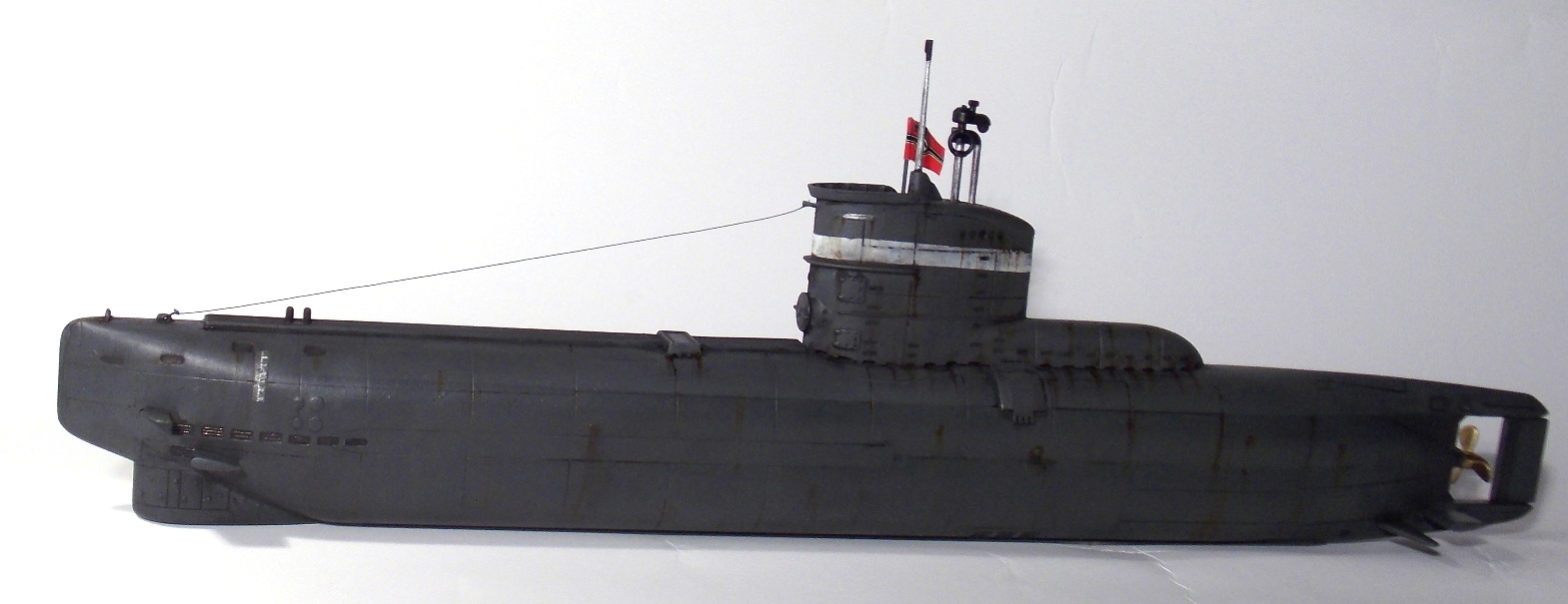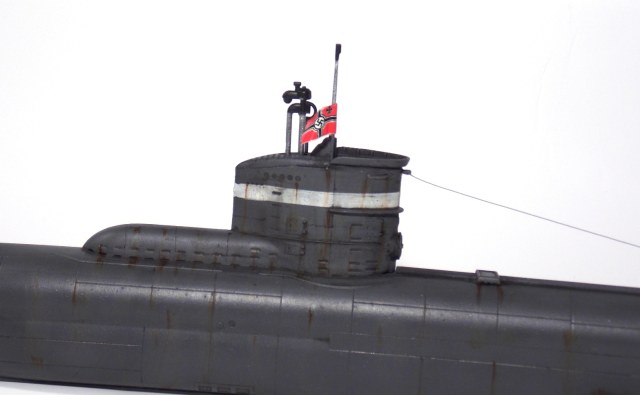В инструкции предлагалось 3 варианта рубки, или как эта часть у подводных лодок называется. Выбрали такую. По сборке ничего особенного, добавлена только антенна из нити для бисера. Грунтовалась модель грунтовкой Mr. Hobby в баллоне. Окраска акрилом Тамии и лаком матовым в баллоне Mr. Hobby. Тонировка, смывка масляные краски "Мастер-класс". Полоса белая- декаль от Т-34 на Берлинскую операцию. Флаг и отметки о погружении декаль "Бегемота", покупал как-то давно, когда "Бимарк" строил.