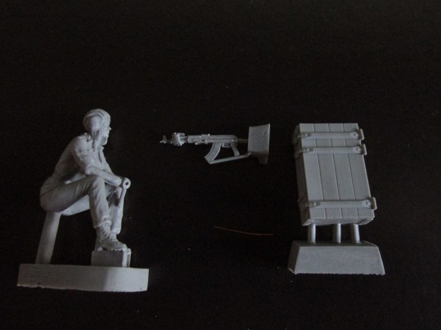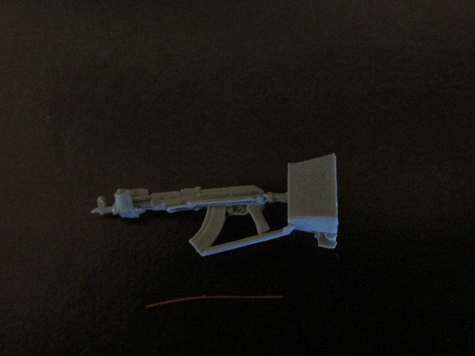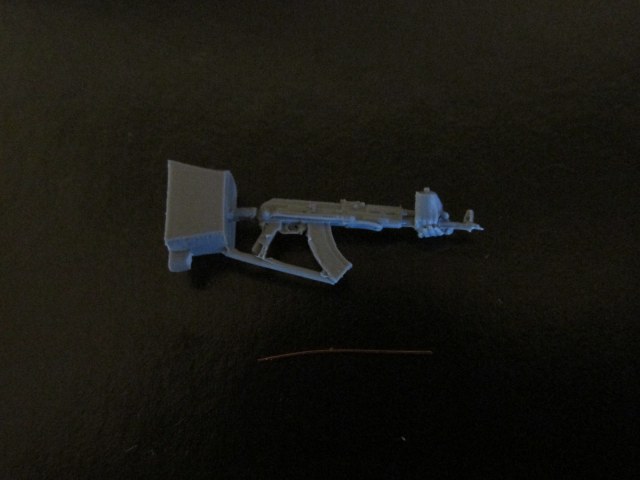Во втором пакетике кусок медной проволки длиною 15-16 мм (для имитации шнура от шлемофона к штекеру), и автомат АКМС, на стволе и газовой камере отлиты кисти рук. Качество литья также отличное, даже ствол просверлен, стыкуемость покажет сборка. Единственное что нужно, более чётче выразить плечевой упор на прикладе, сливается с цевьём.