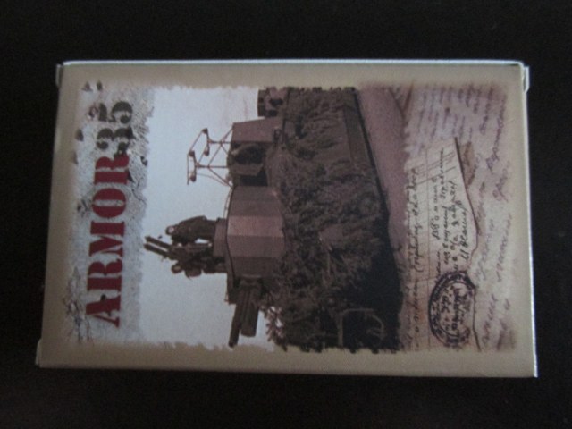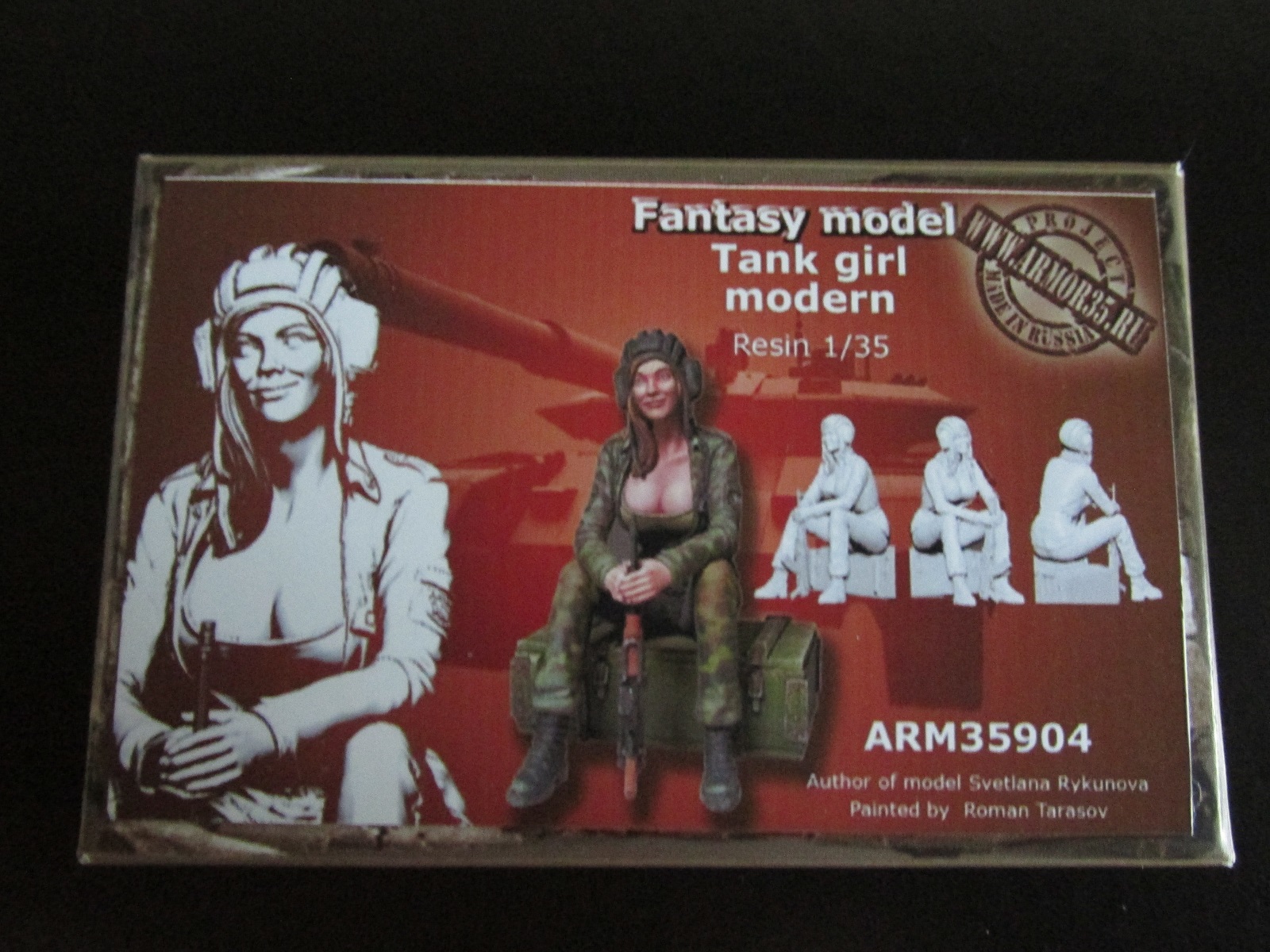 Итак, стандартная коробочка 85х55х25 мм. с боковой загрузкой. На лицевой стороне красочный бокс арт, на красновато малиновом фоне изображена девушка в шлемофоне и форме в камуфляже в расцветке под “флору”, с “калашом”, сидящая на ящике, на заднем плане изображён танк Т – 90, артикул ARM35904.