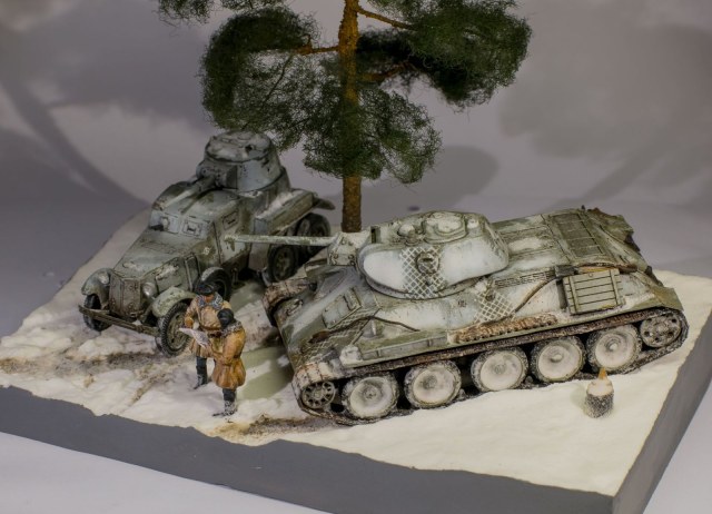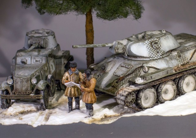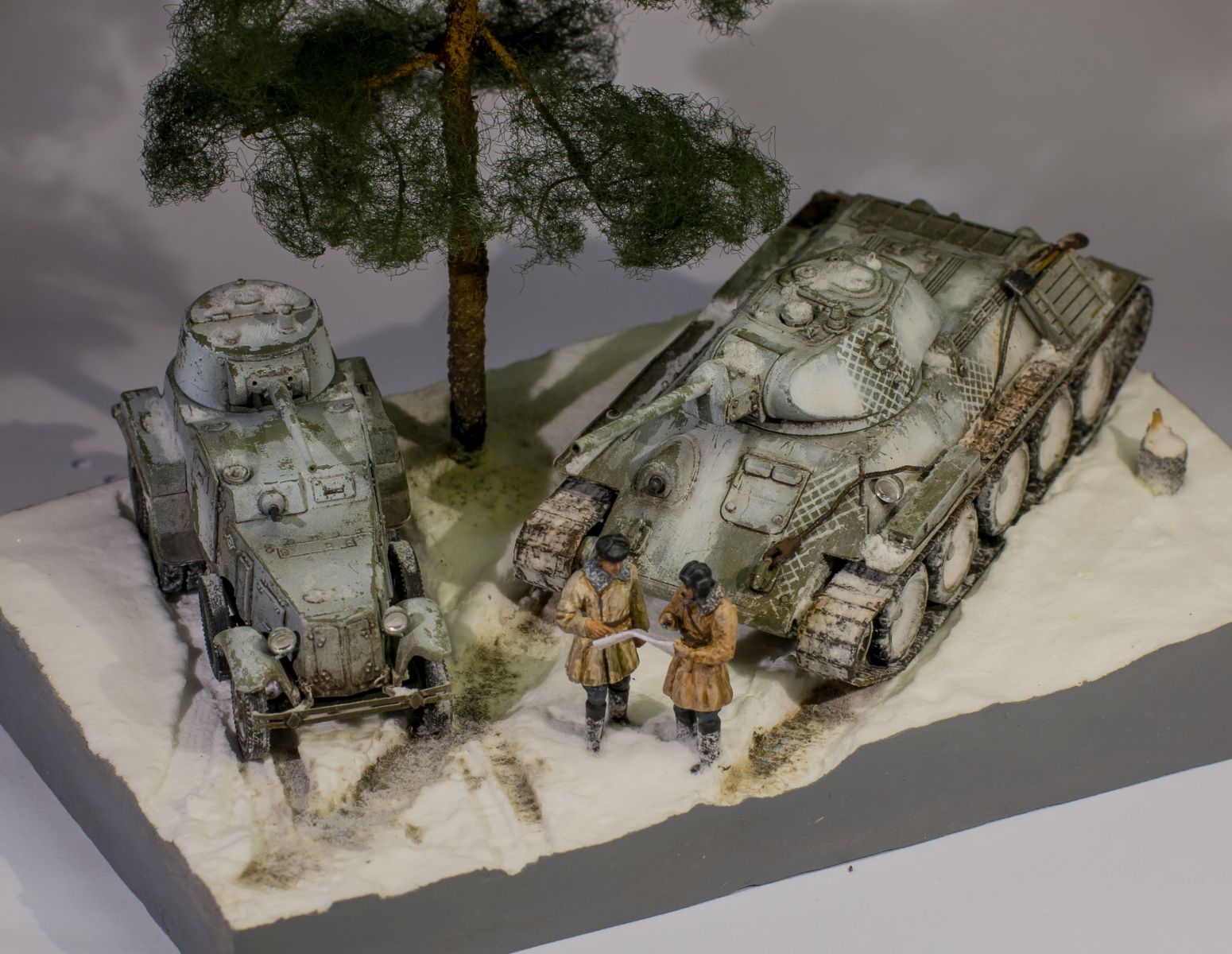 Взбрело мне в голову попробовать зимнюю тематику и наткнулся я на фото времени зимы 41-42 годов, во время битвы за Москву. На фото изображены танкисты 1-й гвардейской танковой бригады, тридцатьчетверка и ба-10. Причем танк имеет сетчатый камуфляж, что тоже захотелось попробовать воссоздать. Наборы специально не покупались, всё делалось из запасов, в результате чего имеются косяки.