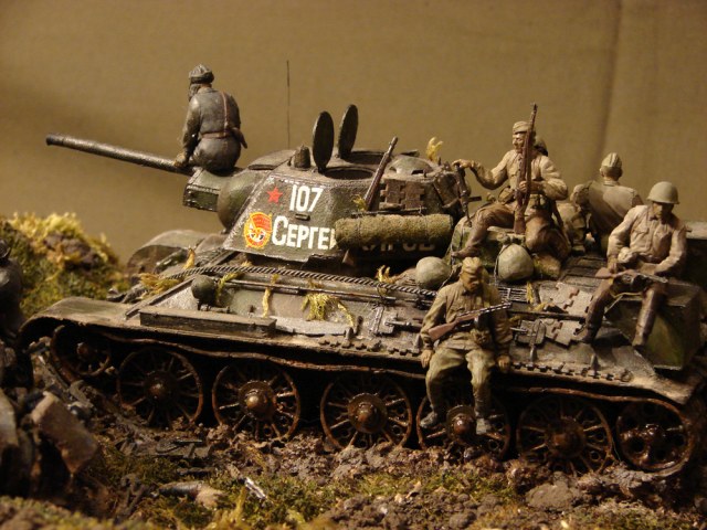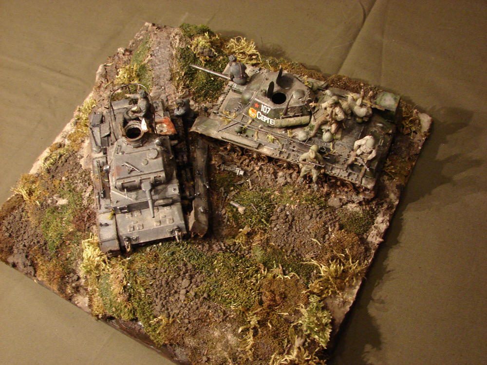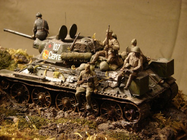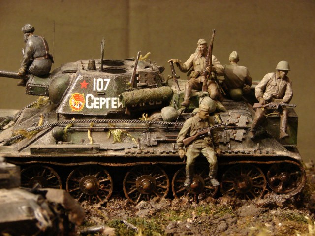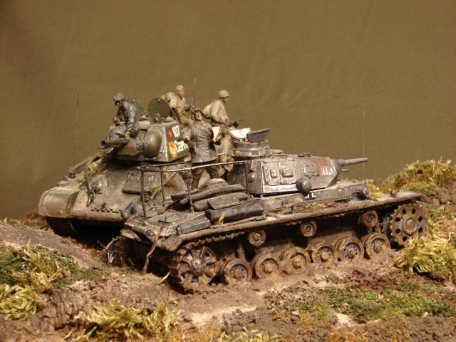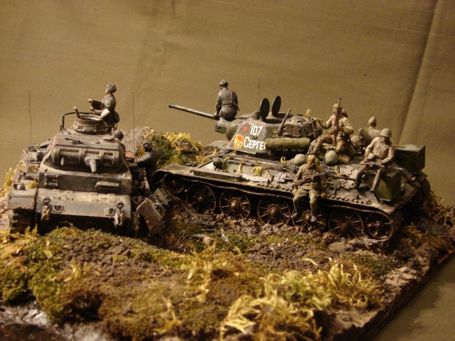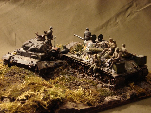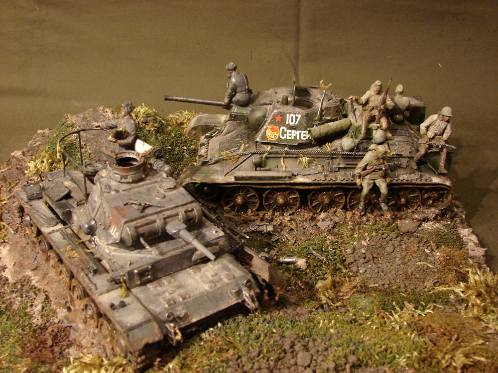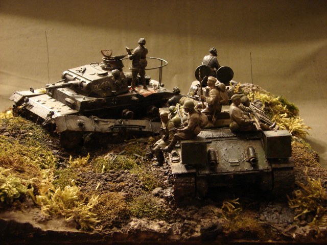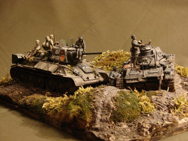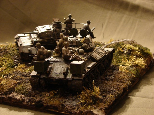 Для первой диорамы очень даже хорошо. Но, к сожалению, есть небольшие "косячки", которые сразу бросаются в глаза. Если будете и дальше заниматься моделизмом, то, конечно же, будете и сами уделять им побольше внимания. Во-первых, нужно устранять швы от литья на фигурках - они особенно видны на рукавах и штанинах. Также видны следы от литья на технике, в частности, на запасных траках на Т-34. Во-вторых, на чём сразу заострилось внимание - чересчур мокрые катки у Т-34. Почва более-менее сухая, а катки, будто бы из шланга политы. В-третьих, у брошенного немецкого танка пулемёт, наверняка, не сохранился бы. Его, как одно из самых ценных арсеналов на войне, в один миг утащили бы или немцы, или наши - любая проходящая мимо воинская часть. Пока танкисты и пехота "зевают", пронырливый боец уже вытаскивал бы пулемёт из башни. В-четвёртых, ремни нужны на всём оружии. Отсутствие ремней сразу бросается в глаза какой-то пустотой и недоделанностью. Ну, и, конечно, расположение фигурок не очень понятно. Особенно старший из танкистов, стоящий на немецком танке - напоминает чтеца-декламатора, вещающего в пустоту, но остальных бойцов его болтовня явно не интересует. У всех отсутствующие позы, не говорящие ни о чём. Вот так побурчал, уж простите... Мало кто из моделистов без "косяков" начинал дорогу в творчестве. Так что, если постараетесь учесть рекомендации, которые Вам дадут коллеги - хорошо. Пойдёте своим путём, "набивая шишки" - тоже неплохо. Опыт всё равно придёт, рано или поздно. Удачи в творчестве и новых замечательных работ!!!