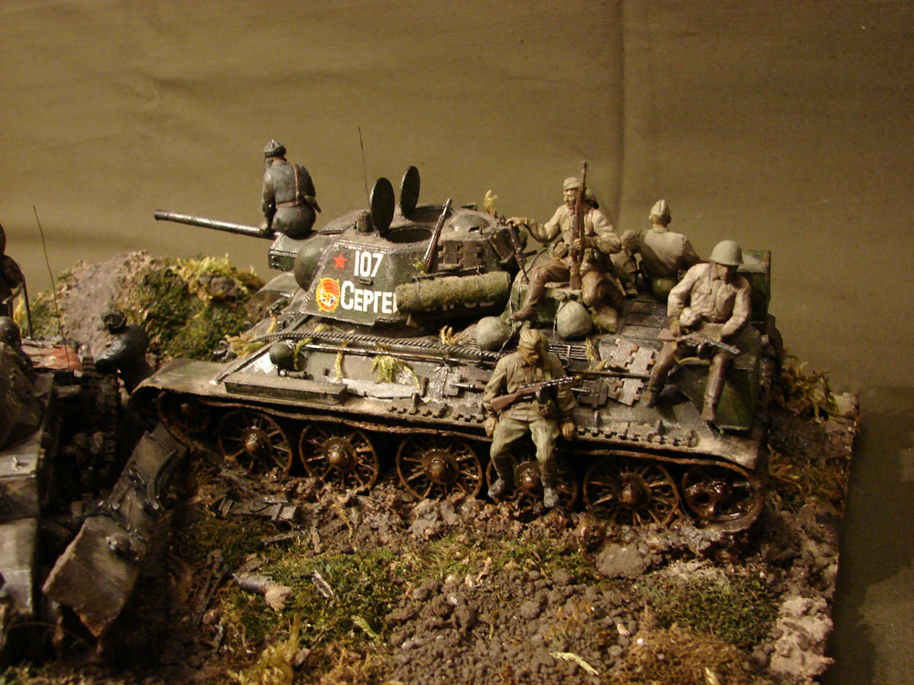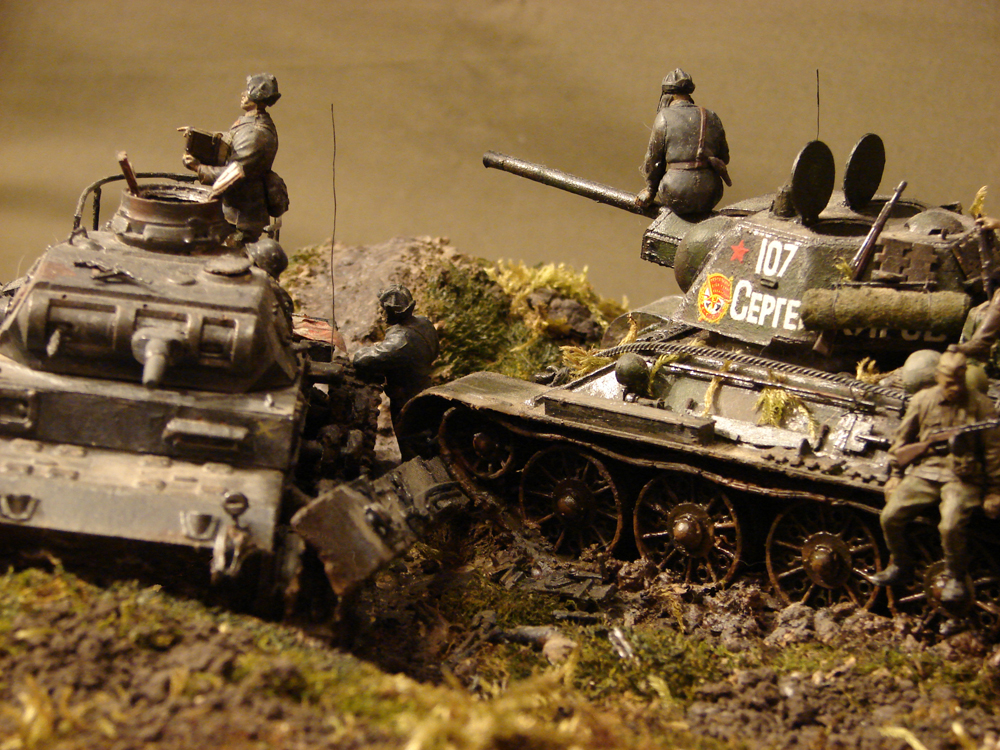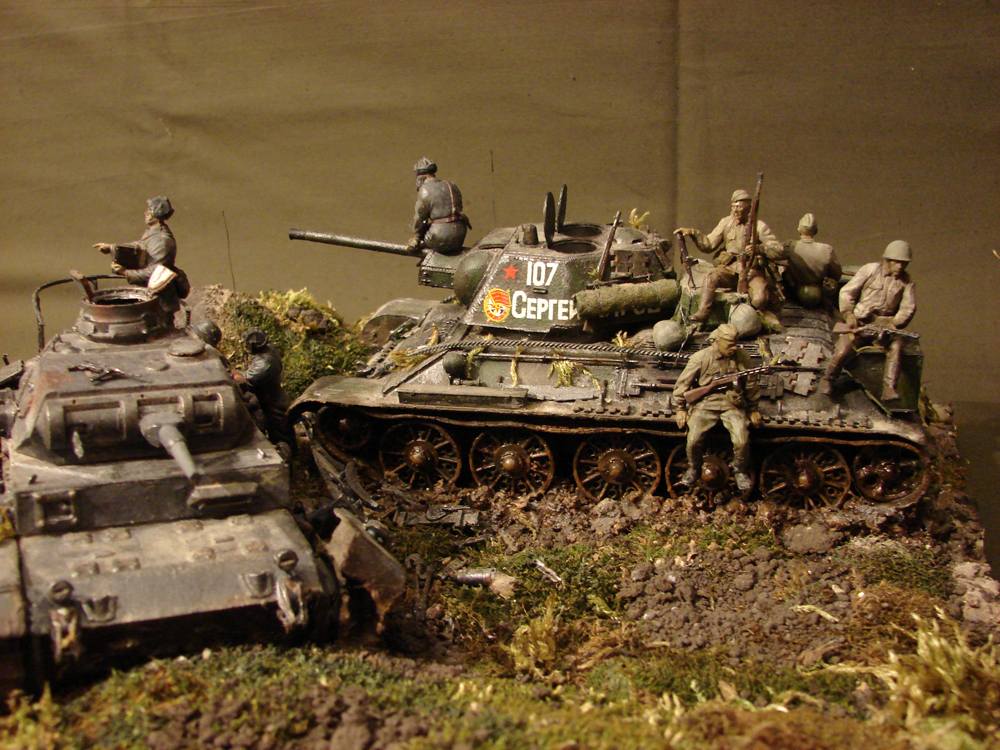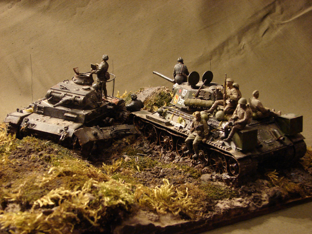 Приветствую. Человечки не так плохи ИМХО. Матчасти танков не касаюсь в силу незнания, больше вопросов к самой композиции и расположению объектов. Как уже было сказано выше есть некоторая нелогичность в таком расположении техники - 34-ка почти наехала на подбитый танк, к тому же спереди бугор и, чтобы дадьше двигаться танкисту придется или брать препятствие, или сдавать назад. А зачем?