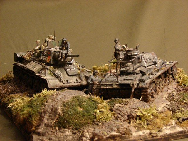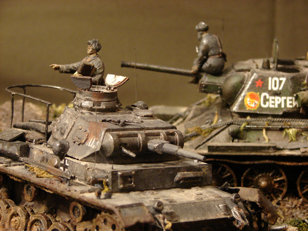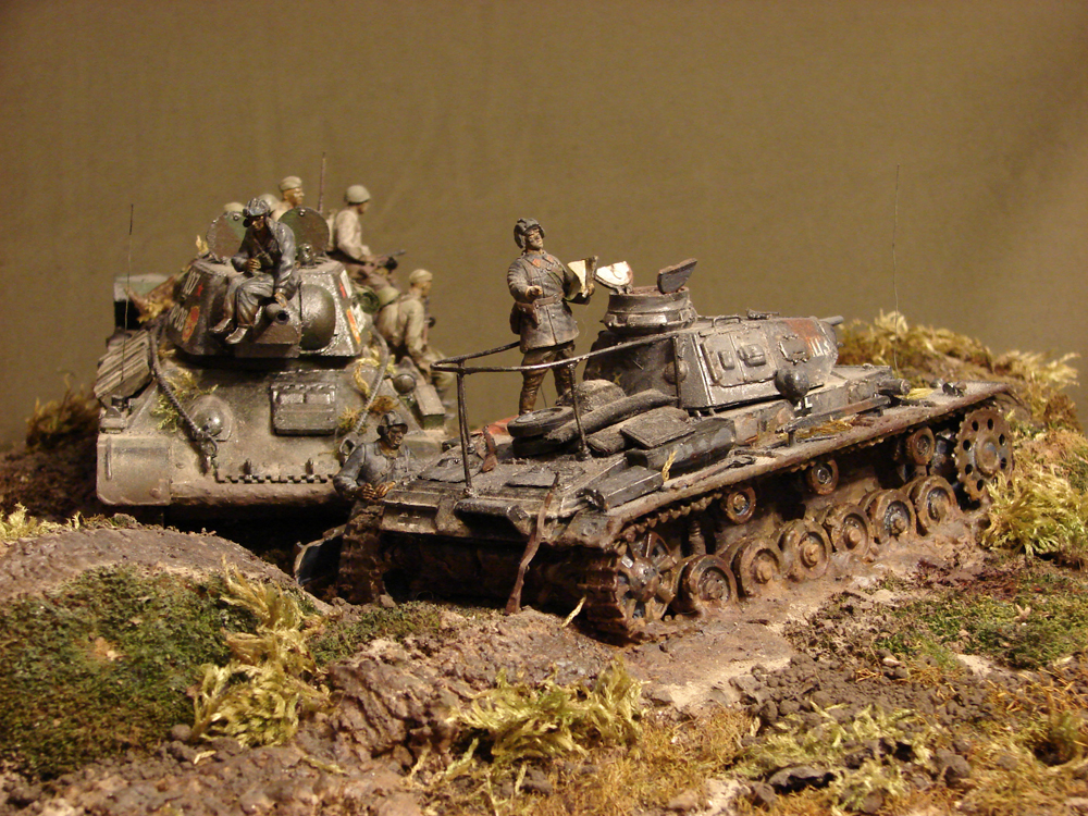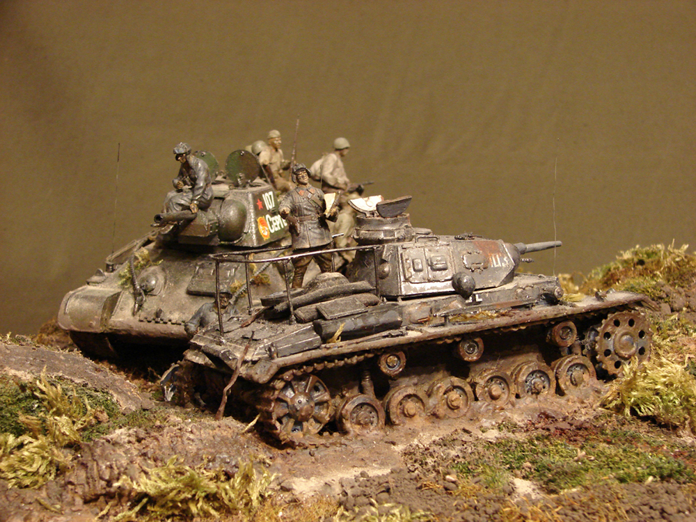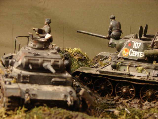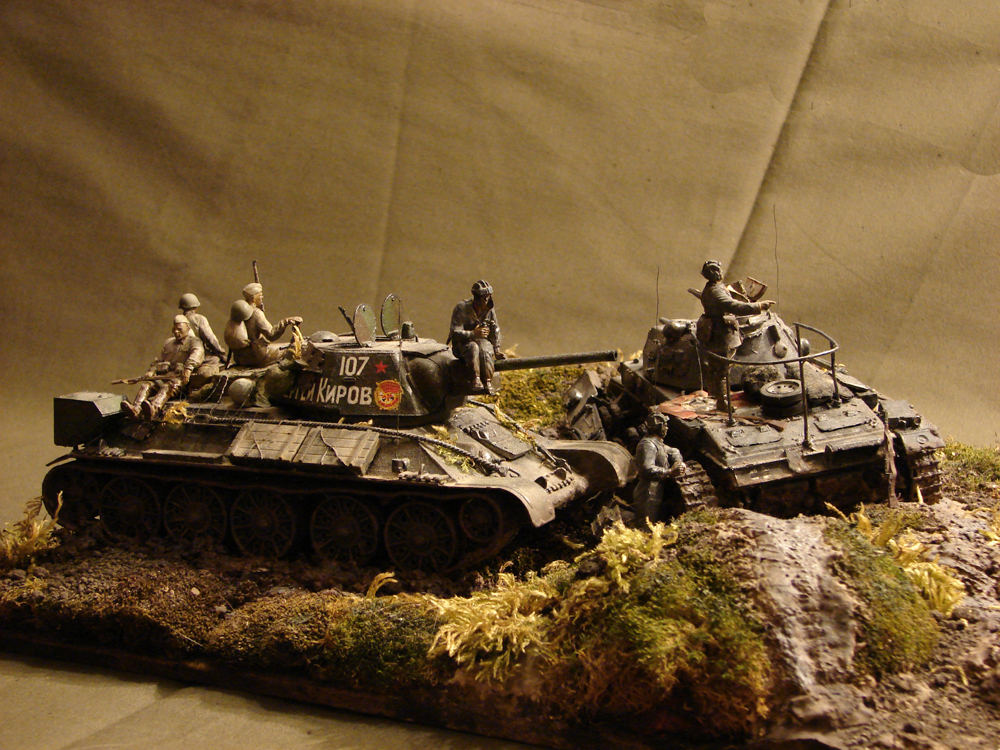 Приветствую. Человечки не так плохи ИМХО. Матчасти танков не касаюсь в силу незнания, больше вопросов к самой композиции и расположению объектов. Как уже было сказано выше есть некоторая нелогичность в таком расположении техники - 34-ка почти наехала на подбитый танк, к тому же спереди бугор и, чтобы дадьше двигаться танкисту придется или брать препятствие, или сдавать назад. А зачем?