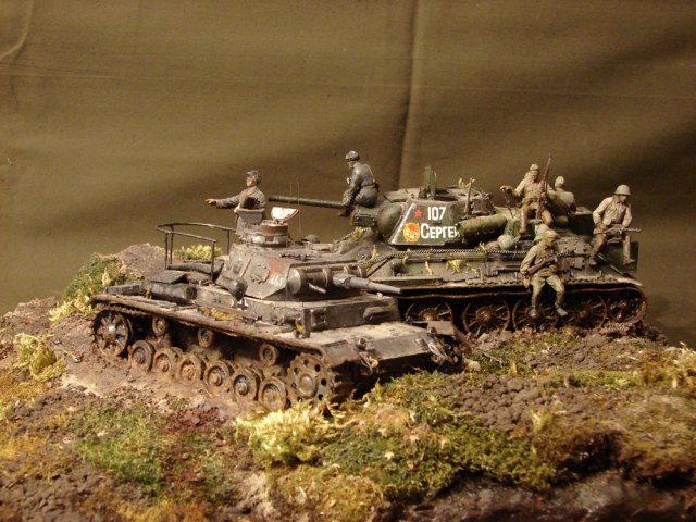 Спасибо, обязательно учту в будущем. А насчет МП-возможно, не очень отчетливо я сделал кровавый след, тянущийся от танка, надо было б в легенде, думаю, написать, что, мол: "Немецкий танкист стрелял из личного оружия, пока не был ранен (об этом говорит лужа кровавая и след, тянущийся от танка)". Или надо было б труп сделать, а не так, что, мол, уполз полудохлый, мой косяк.