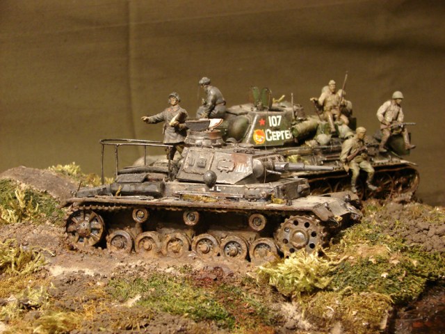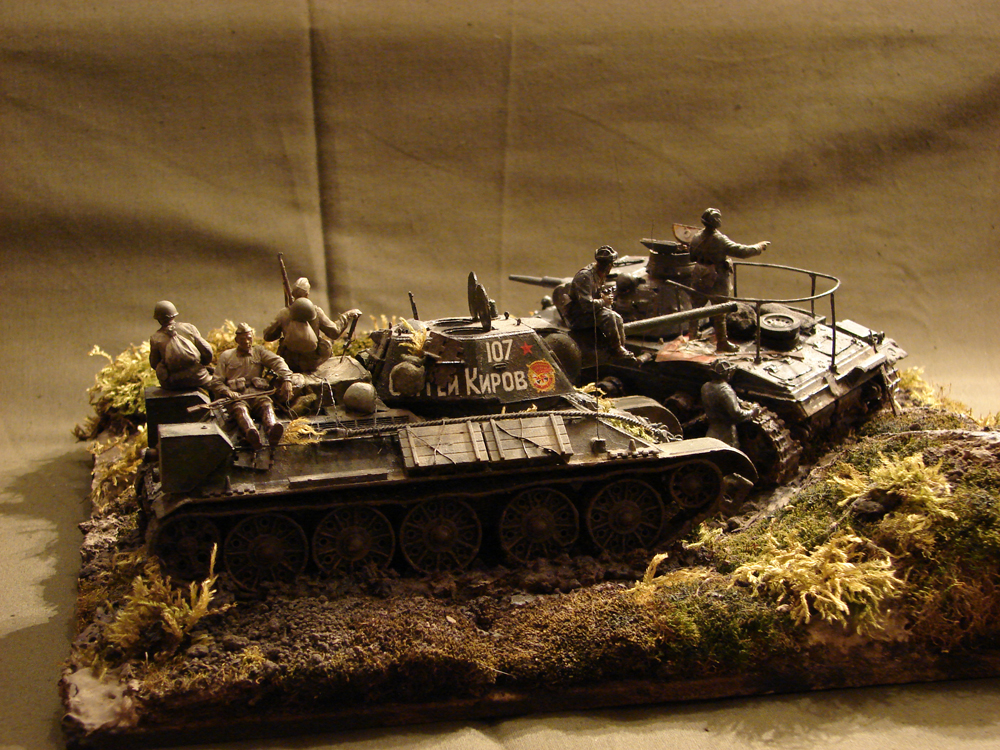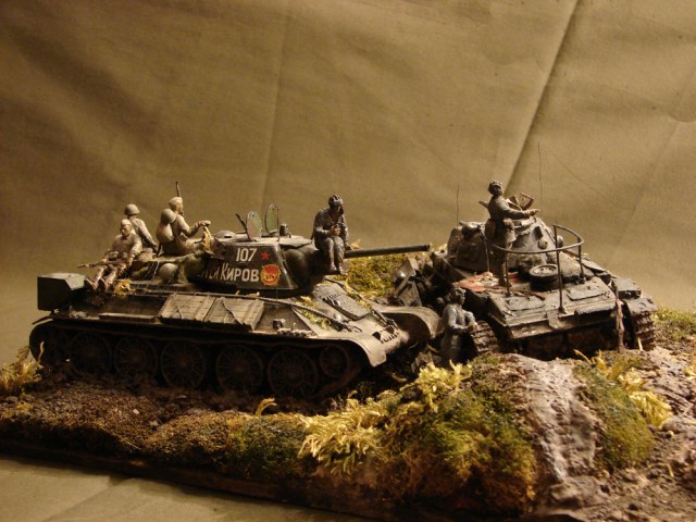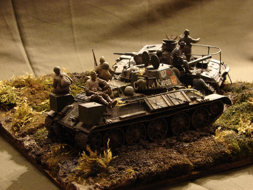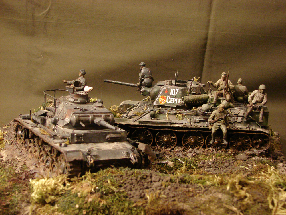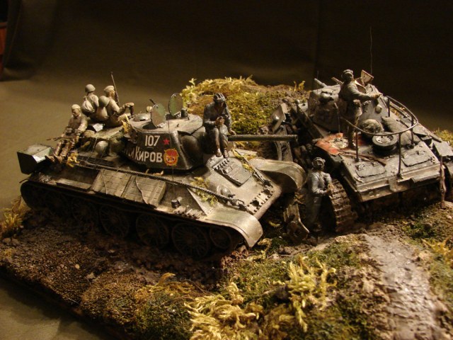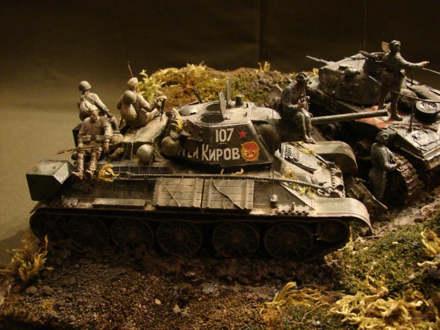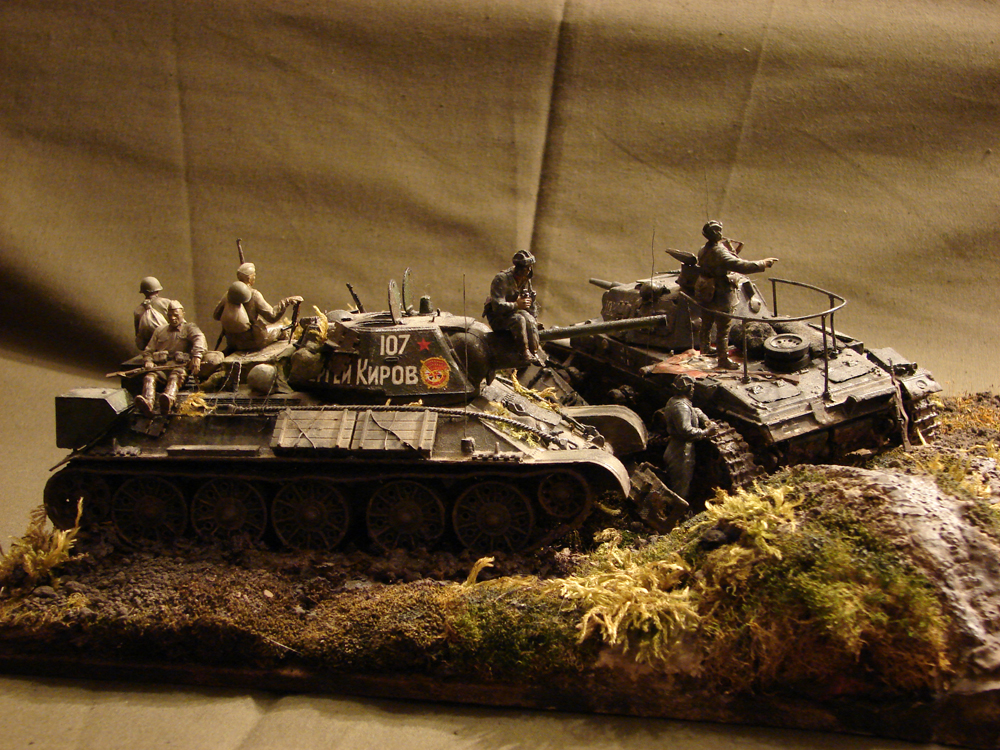 Танк Т-34 обр. 1942 г. №107 "Сергей Киров" с танковым десантом из 1-й Краснознаменной Ленинградской танковой бригады остановился у подбитого в ходе локальных фланговых ударов РККА на Ленинградском фронте командирского танка Pz III из 1-й танковой дивизии вермахта. Командирский Pz III получил два попадания из 45-мм орудия в левый борт башни, а так же два попадания 76-мм орудия в левый борт корпуса. Брошенные немцами оружие и вещи еще не успели утащить. Теперь экипаж и танковый десант ожидают дальнейших указаний; комбат объясняет обстановку рядом стоящему командиру танка Т-34 обр. 1942 г. №107 "Сергей Киров", стоя на командирском Pz III.
