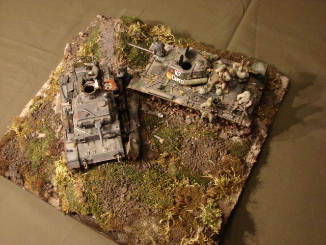 Моя первая диорама, опыта вообще нет, да и когда я начинал делать, особого рвения не было, зато потом втянулся и немного огорчился от ошибок, которые я сделал по матчасти. Роспись фигур (особенно лица) ни в какую не получалась, поэтому оставил довольно топорную у них окраску (еще одно огорчение). Старался сделать максимально реалистично. Долго не решался выставить, и вот, спустя множество месяцев представляю свою диораму.