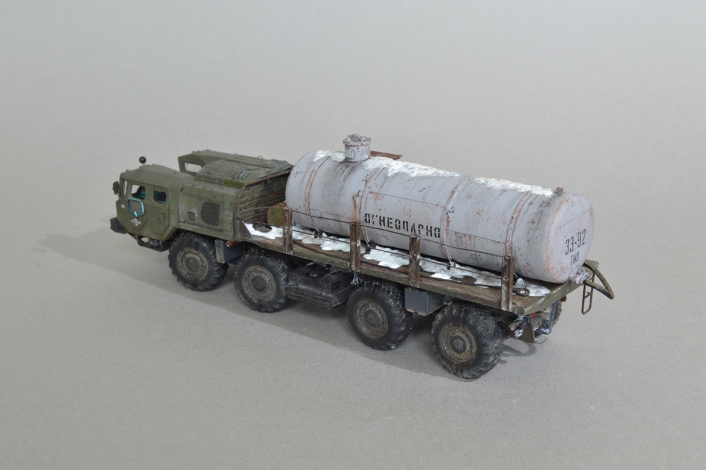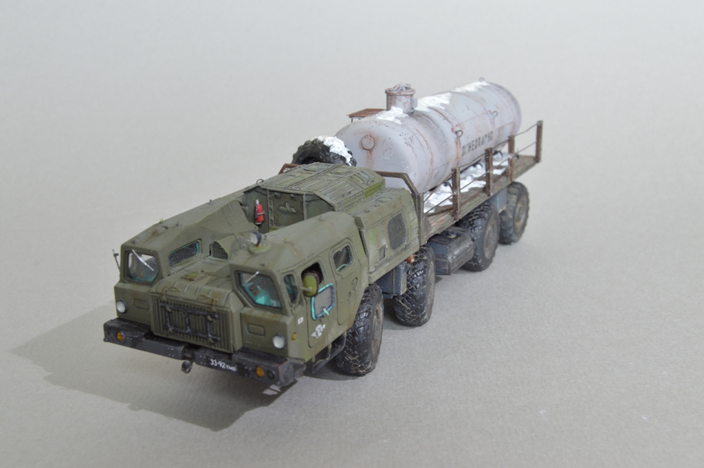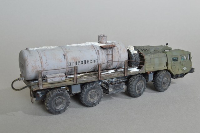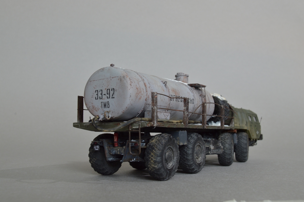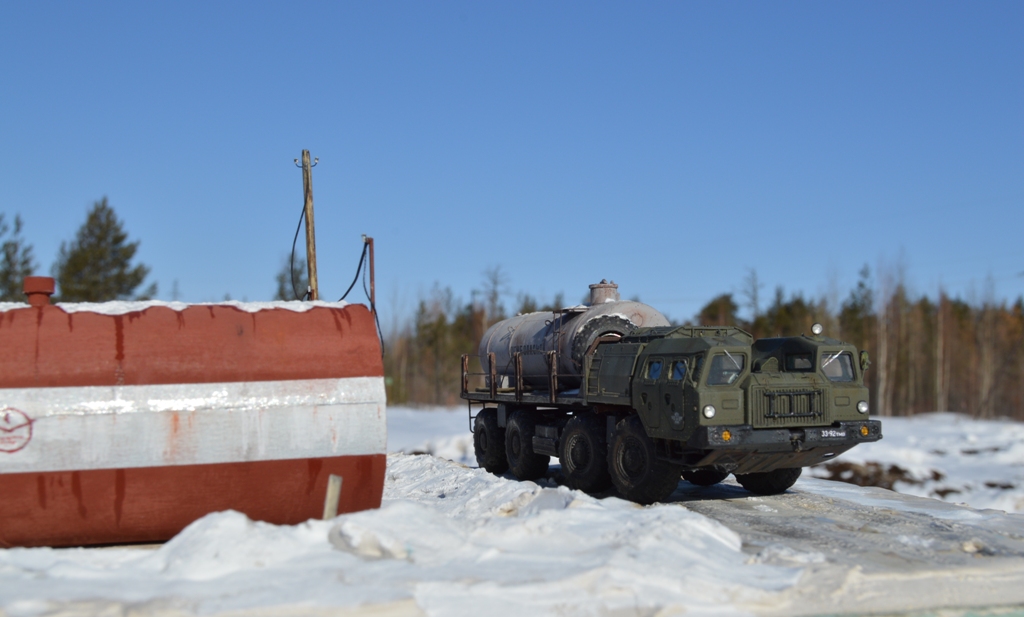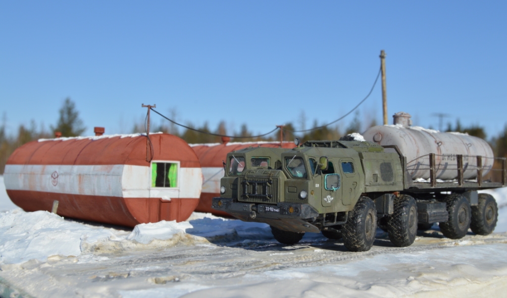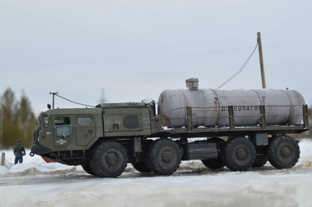 Представляю вашему вниманию еще одну свою поделку.Приобрел набор от Тохсо по моему года два тому назад.В коробке,многие знают, Маз-543 Эльбрус,но так как мое направление в моделизме сугубо гражданское,долго думал,что бы из него замутить.                      Первый раз "Ураган"я увидел в Уренгое, в начале 70-х.Сосед по площадке постоянно около дома ставил когда из рейса приезжал.Был он бортовой,правда не помню какая модификация,может 543-й,а может и 7310.Последний в серию пошел с 1973 года.            Думал,думал и придумал делать не 543-го,а 7310.Он с навесным (баки,ящики),на мой взгляд,как то по брутальнее смотриться.Вроде не так давно "Моделколлект"выпустила 7310 бортовой.Я правда в руках его не держал,не знаю насколько он проработан,думаю,что примерно как и от "Тохсо".Короче,что бы не повторяться,свой решил сделать с "бочкой".Такие я тоже видел довольно часто.На обычную бортовую плотформу закреплялась емкость,самодельная или от чего либо,подходящая по габаритам.На них по зимнику саляру на буровые возили.Да и фото оригинала в "однокласниках",в Уренгойском альбоме нашел.