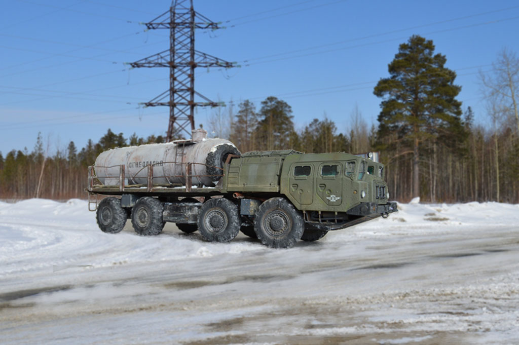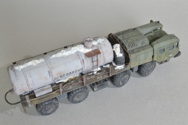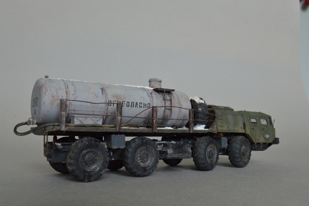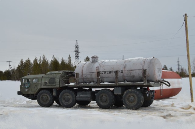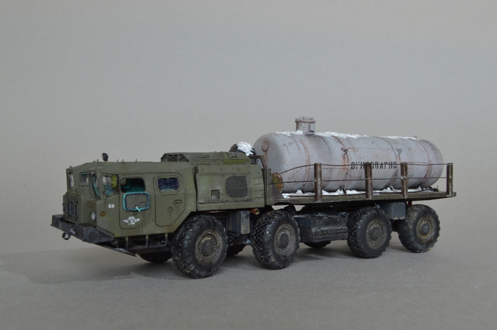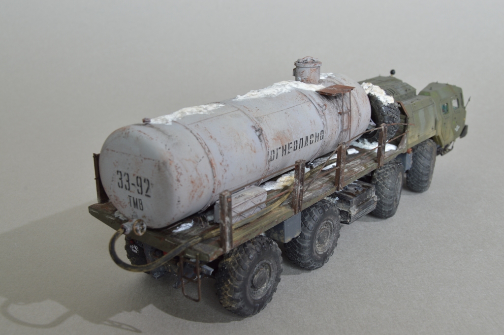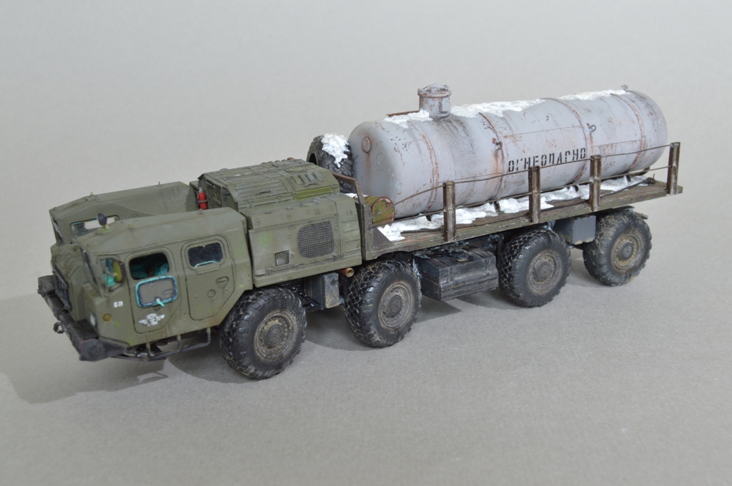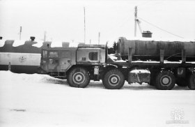 Представляю вашему вниманию еще одну свою поделку.Приобрел набор от Тохсо по моему года два тому назад.В коробке,многие знают, Маз-543 Эльбрус,но так как мое направление в моделизме сугубо гражданское,долго думал,что бы из него замутить.                      Первый раз "Ураган"я увидел в Уренгое, в начале 70-х.Сосед по площадке постоянно около дома ставил когда из рейса приезжал.Был он бортовой,правда не помню какая модификация,может 543-й,а может и 7310.Последний в серию пошел с 1973 года.            Думал,думал и придумал делать не 543-го,а 7310.Он с навесным (баки,ящики),на мой взгляд,как то по брутальнее смотриться.Вроде не так давно "Моделколлект"выпустила 7310 бортовой.Я правда в руках его не держал,не знаю насколько он проработан,думаю,что примерно как и от "Тохсо".Короче,что бы не повторяться,свой решил сделать с "бочкой".Такие я тоже видел довольно часто.На обычную бортовую плотформу закреплялась емкость,самодельная или от чего либо,подходящая по габаритам.На них по зимнику саляру на буровые возили.Да и фото оригинала в "однокласниках",в Уренгойском альбоме нашел.