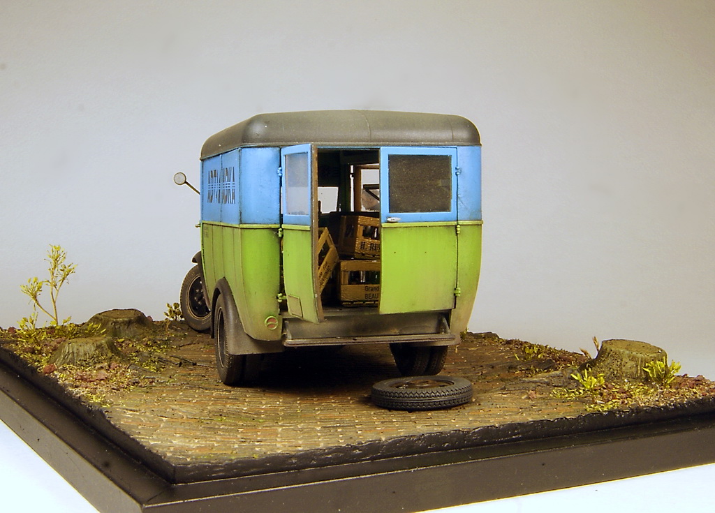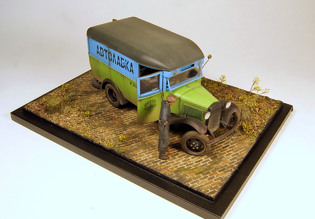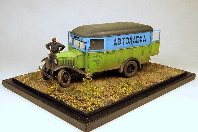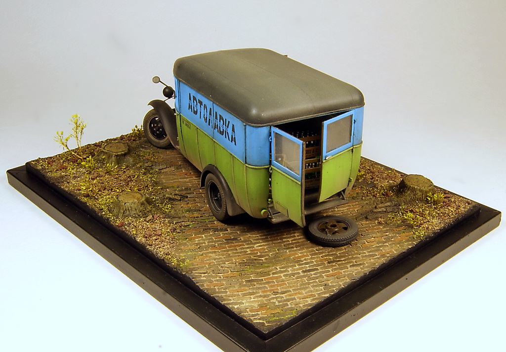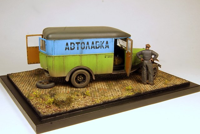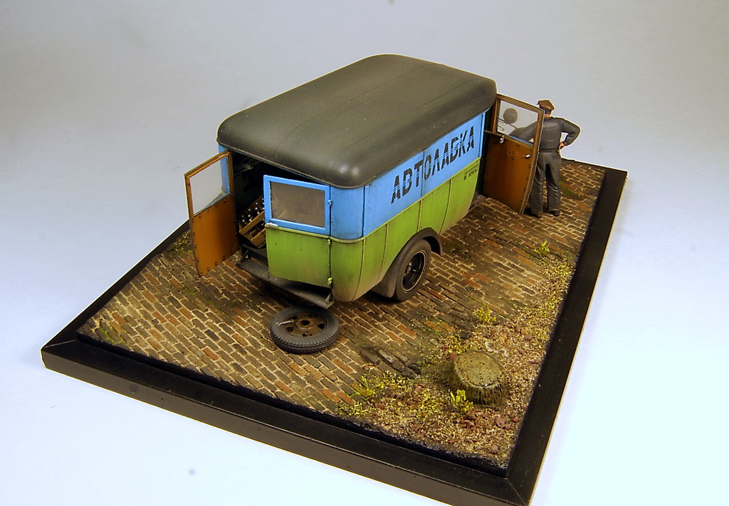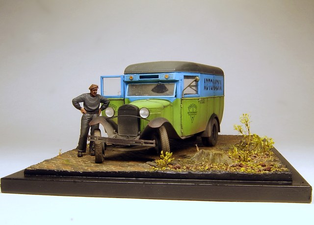 Незатейливый сюжет на тему плохих дорог и отсутствия домкрата в нужный момент. Миниартовский Газ 0330 был перешит из пассажирской версии в коммерческую, колеса из набора заменены на смоляные от Комплект Зип, спущенное колесо от Армор35. В качестве доставляемого товара бутылки и ящики от тех же Миниарт. В качестве основы база от DioDump.