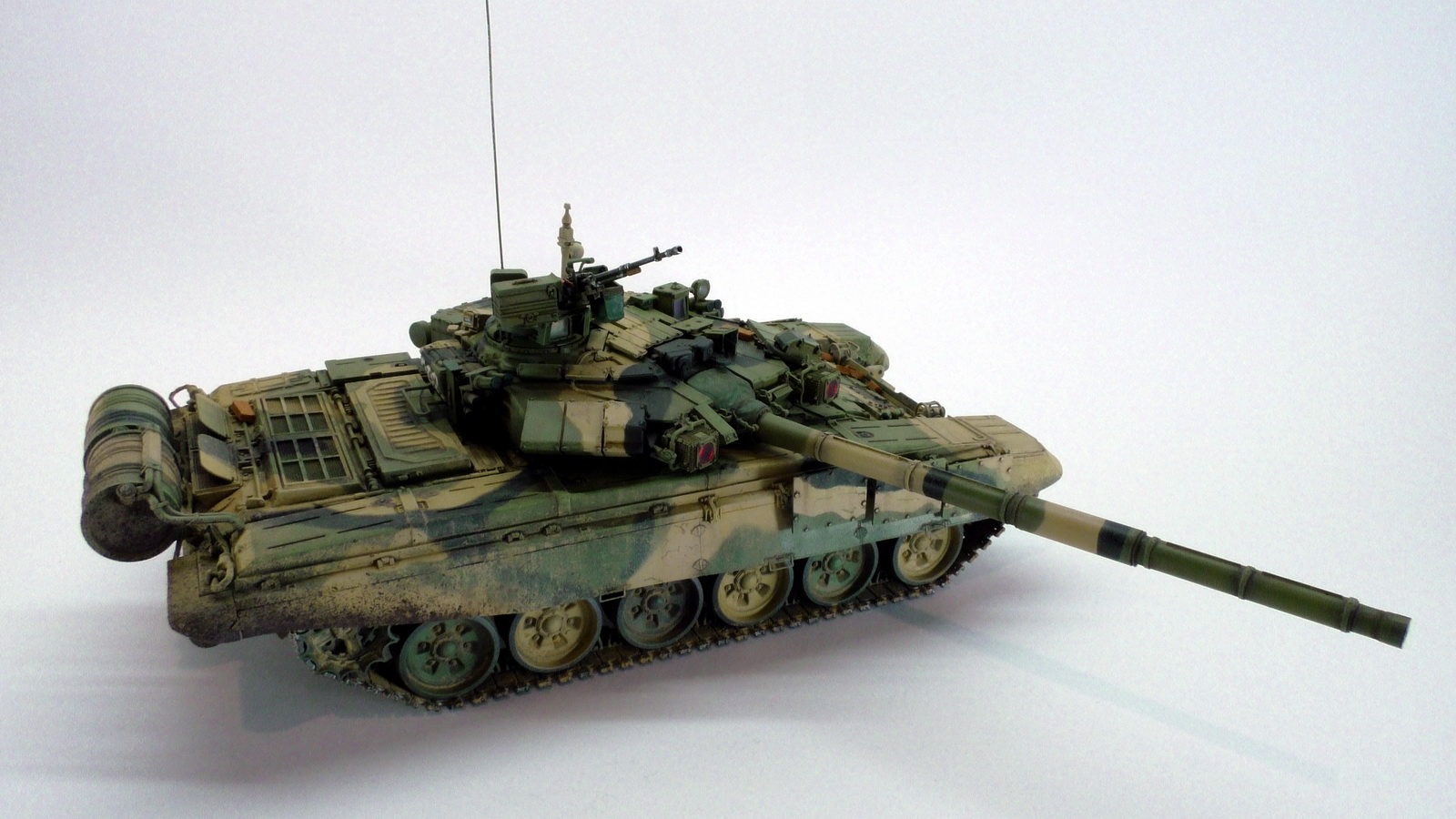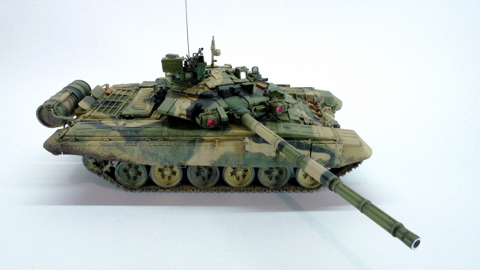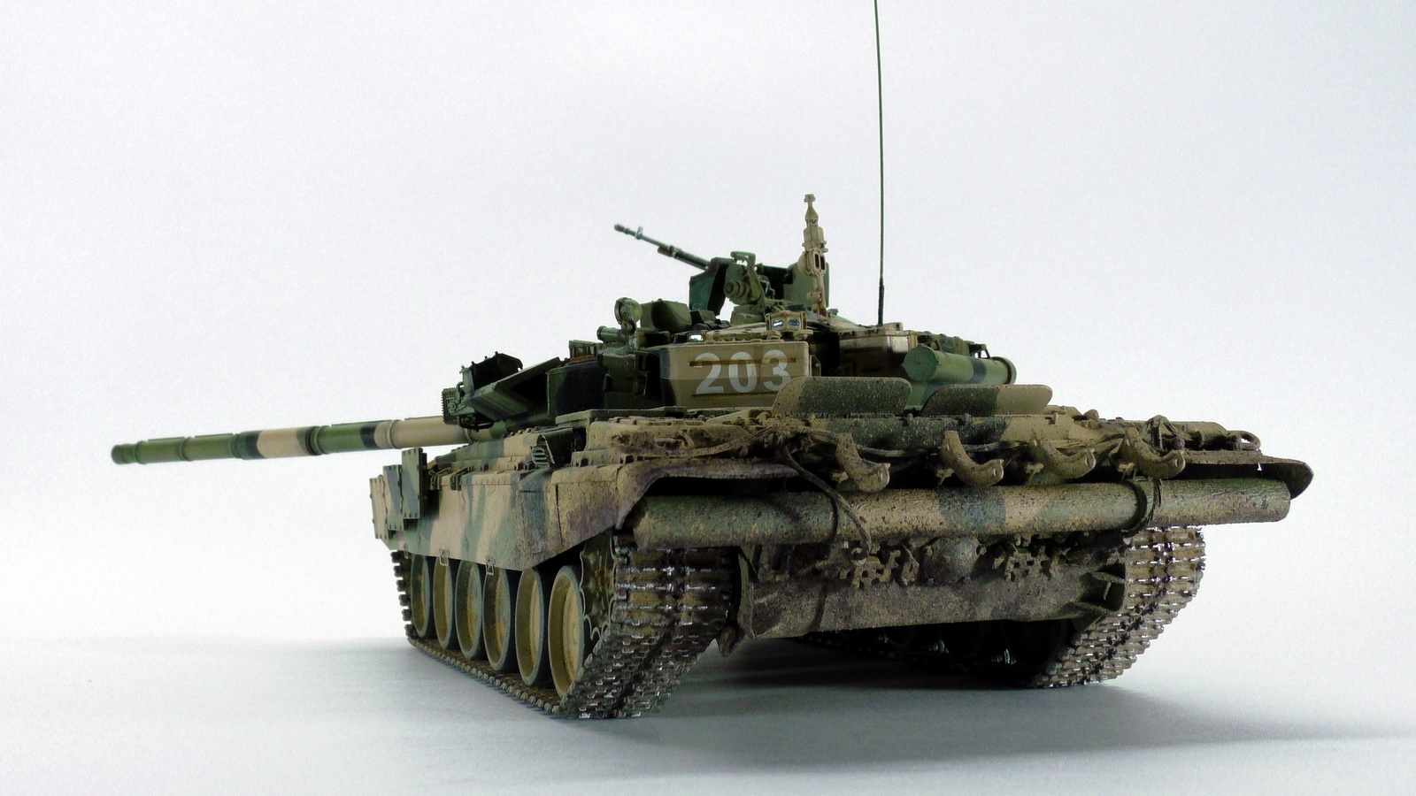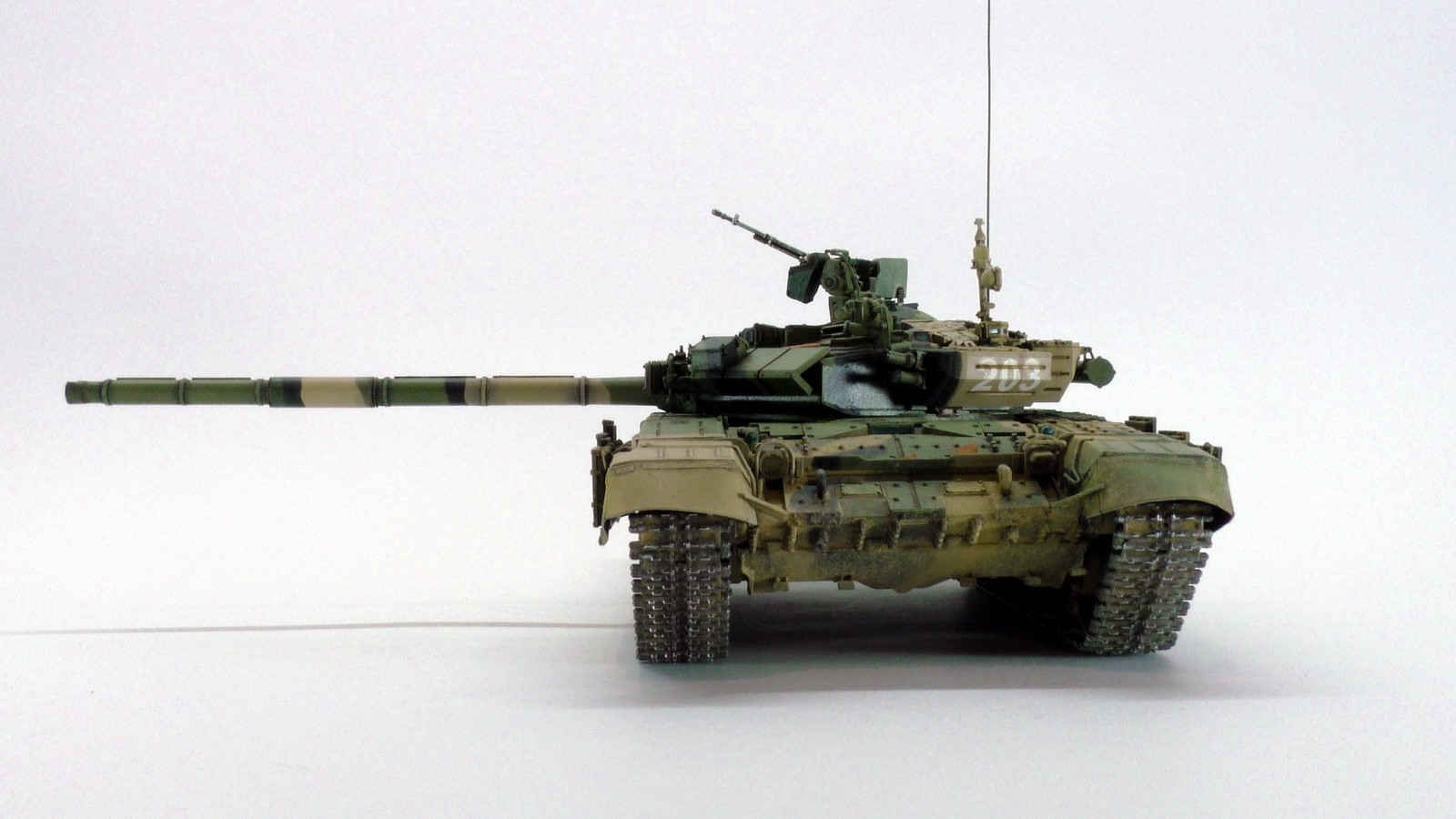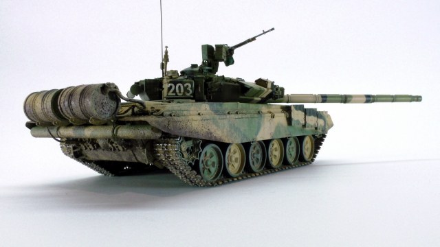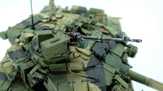 Моя вторая модель в 35м масштабе и первый танк. До это был Хамви Стингер. Из вновь опробованных навыков было нанесение брызг аэрографом и загрязнение гусениц. Баки съёмные (трансформер идишн). В купленном с рук наборе шли конверсионные детали: травлёнка, алюминиевый ствол и резиновые экраны. По мелочи: сделана выборка на лючке выброса поддонов, рассверлен надульник КОРДа, разместил кусочки CD/DVD в приборах. Номер составлен по дате ДР.
