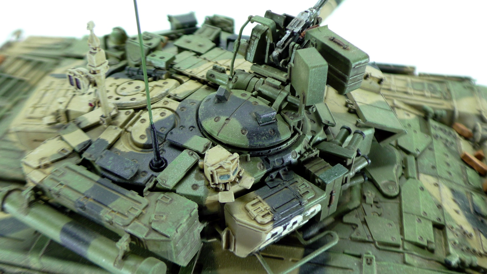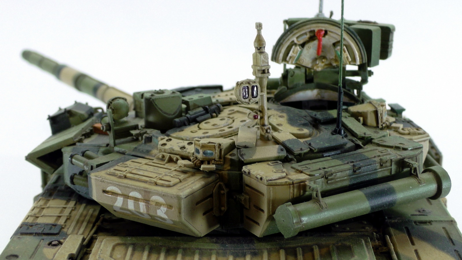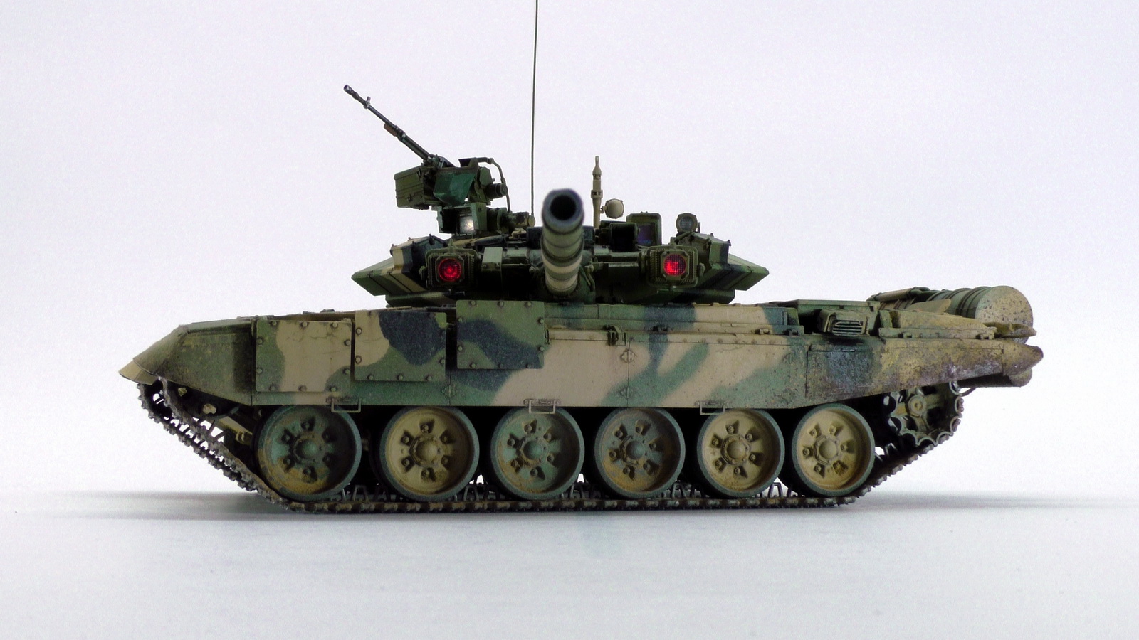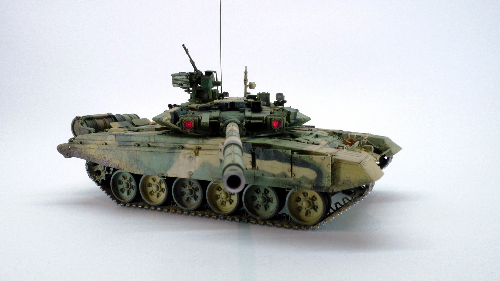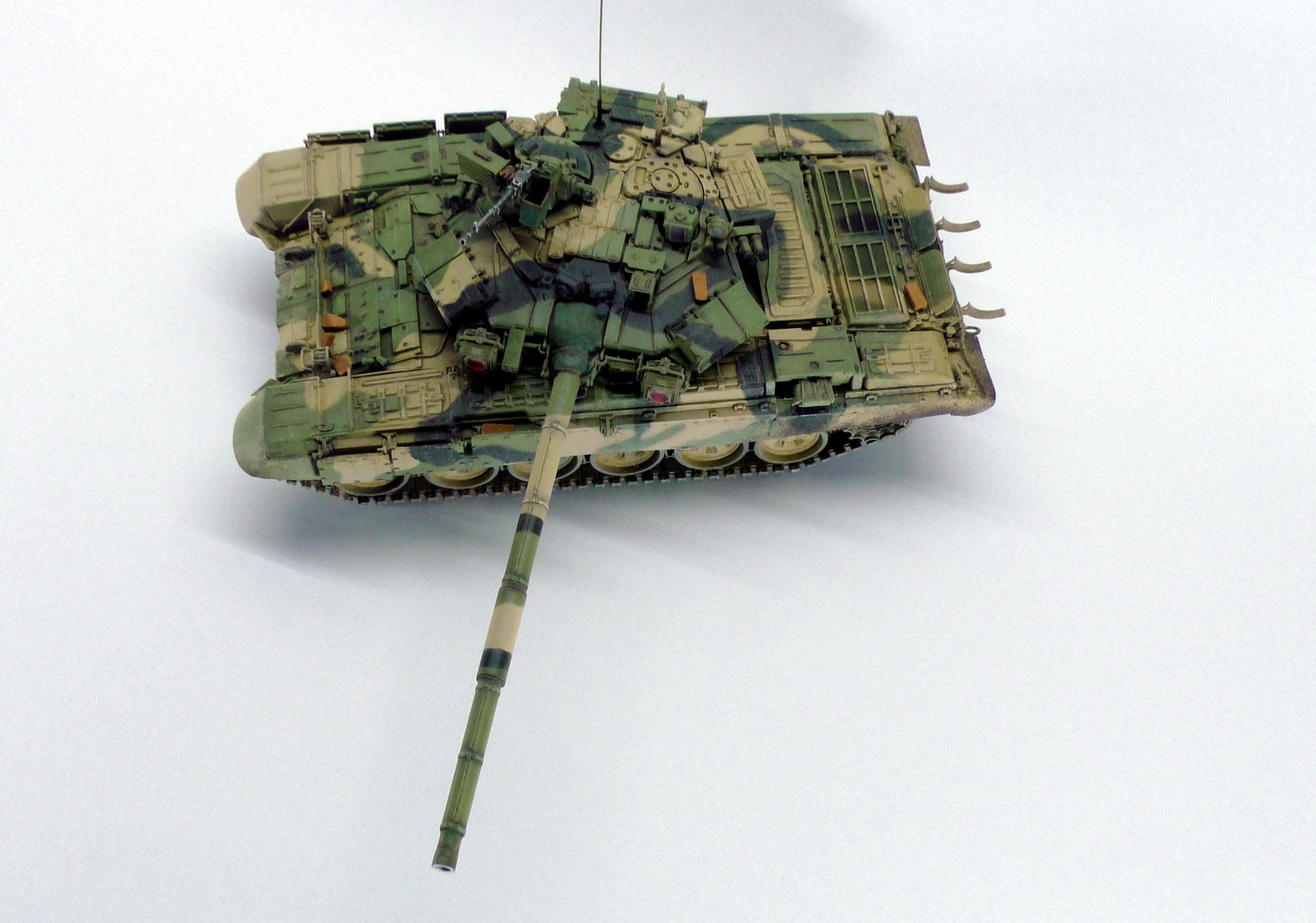 Моя вторая модель в 35м масштабе и первый танк. До это был Хамви Стингер. Из вновь опробованных навыков было нанесение брызг аэрографом и загрязнение гусениц. Баки съёмные (трансформер идишн). В купленном с рук наборе шли конверсионные детали: травлёнка, алюминиевый ствол и резиновые экраны. По мелочи: сделана выборка на лючке выброса поддонов, рассверлен надульник КОРДа, разместил кусочки CD/DVD в приборах. Номер составлен по дате ДР.