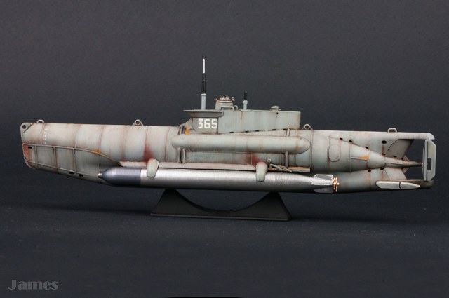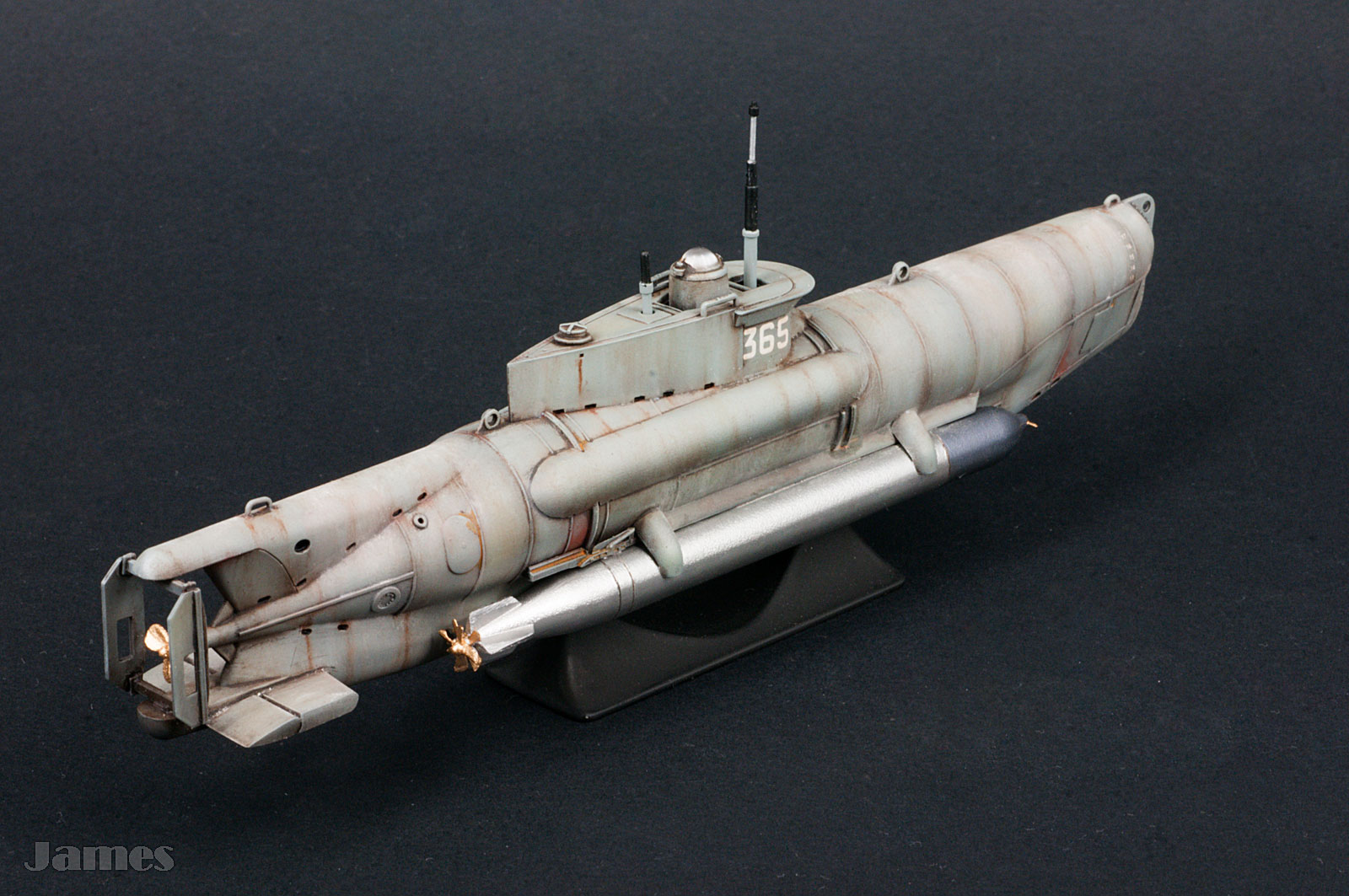 Смотрится лодочка. Ржавчины в меру. В целом галерейная работа. Ну и как же без замечаний. Это по моему вполне можно исправить. Левая торпеда в носовой части слилась с держателем, правая в середине. Раз уж есть зазор - должен быть равномерным по всей длине торпеды. Винт лодки толстоват, края бы заострить.