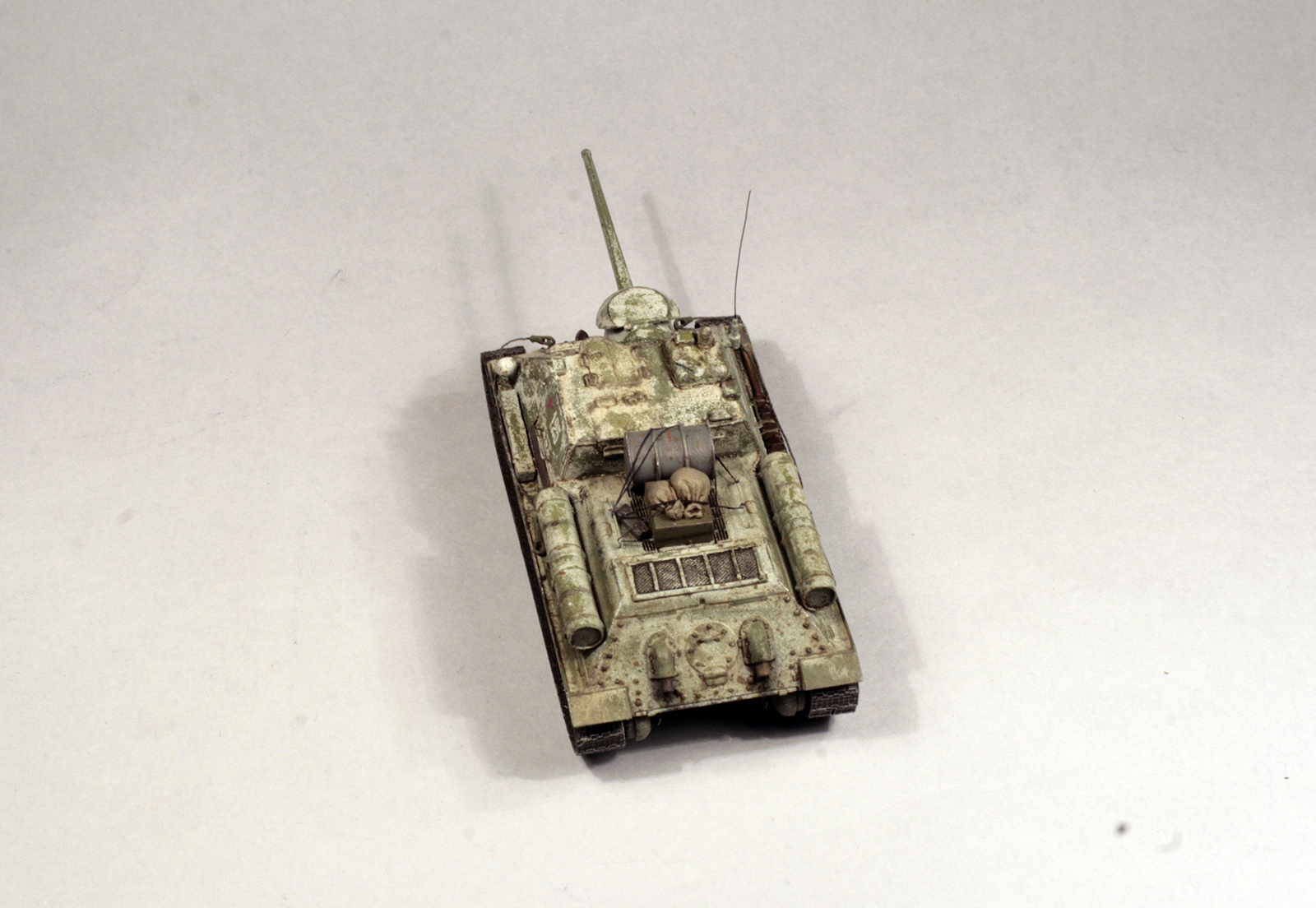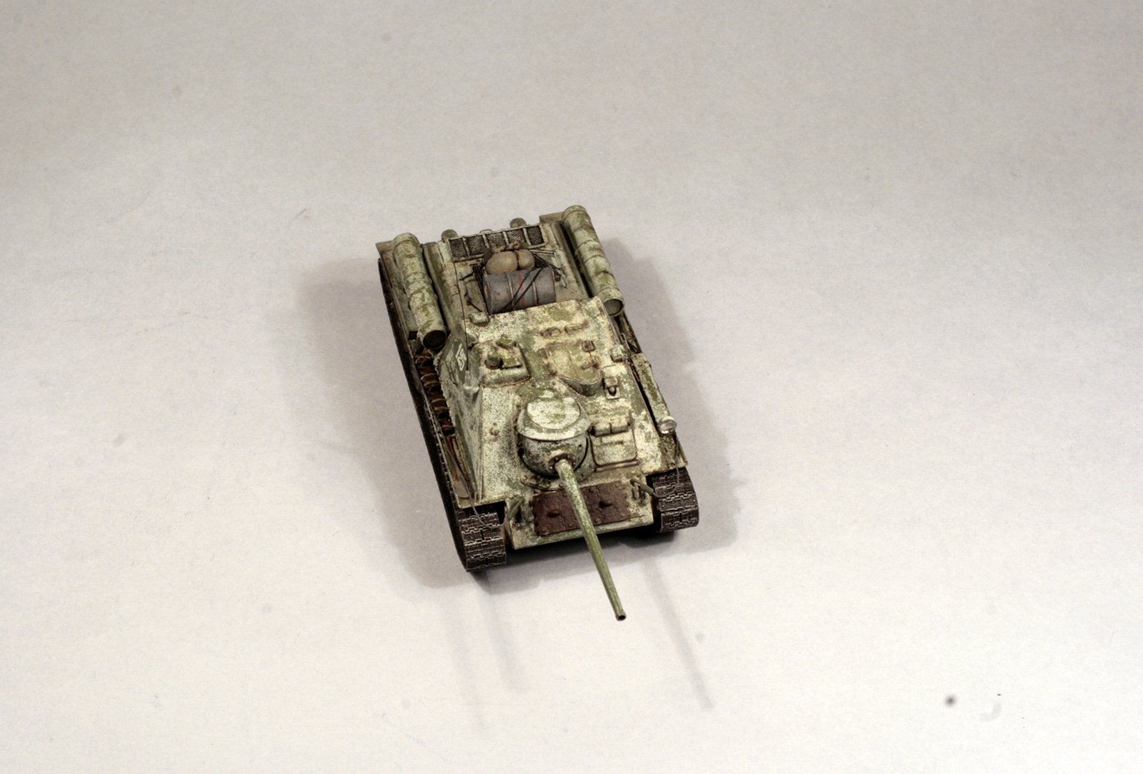 Сборка свелась к доработкам ходовой и экстерьера. Упрощенную ходовую часть я привел в порядок при помощи гусениц от Звездовских моделей Т-34 в 72ом масштабе, установив их вместо родных деталей. Так же добавил фактуру литья на маску пушки и командирскую башенку, добавил сварные швы на борта рубки, высверлил патрубки, добавил самодельные поручни и тросы, на заднем листе МТО заменил болты на Мастер-Клаб, поставил фару от Эльфа, накидал всякого скарба из запасов, из фольги сделал каркас решетки охлаждения на МТО.