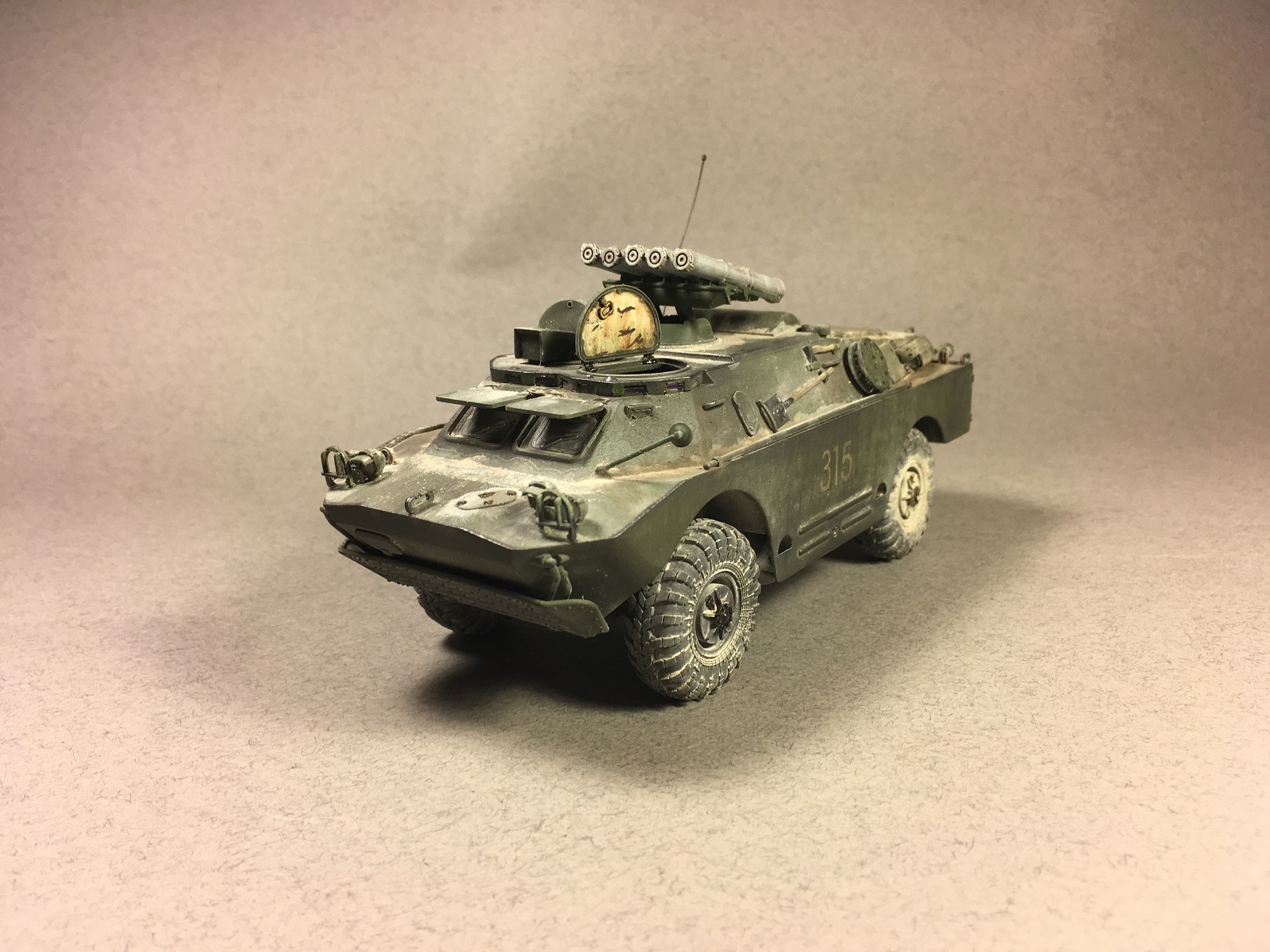 Модель собиралась около полугода из коробки. Из дополнительного только колеса Miniarm и самодельная антенна. Окрашена красками hobby color h340. Химия Ammo mig, AK, масло Abteilung 502. Впервые попробовал работать с пигментами. Модель достаточного хорошего качества, правда есть небольшой косяк со стыкуемостью перегородки салона.
