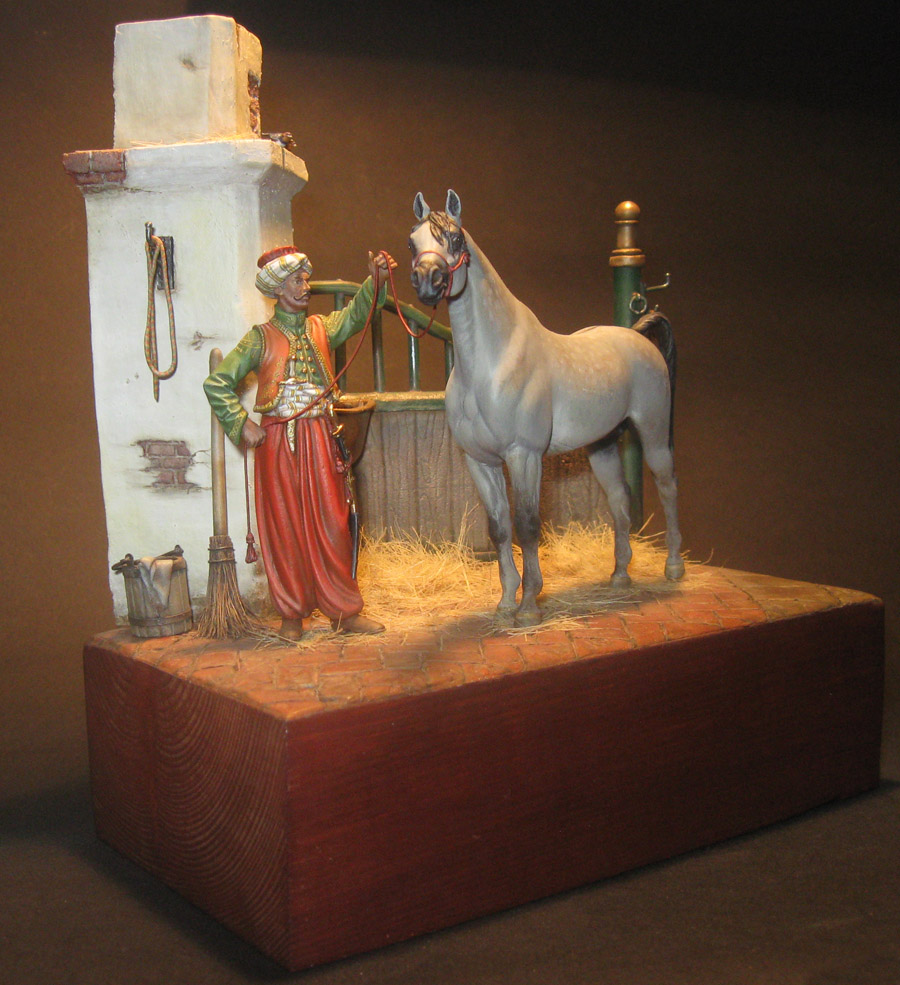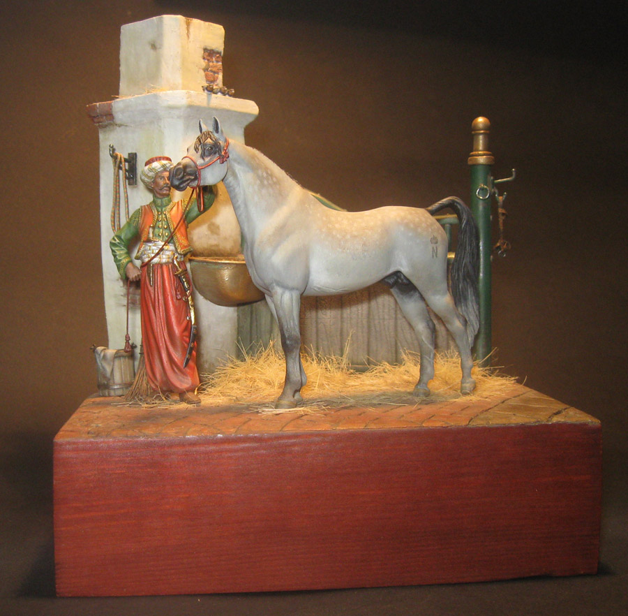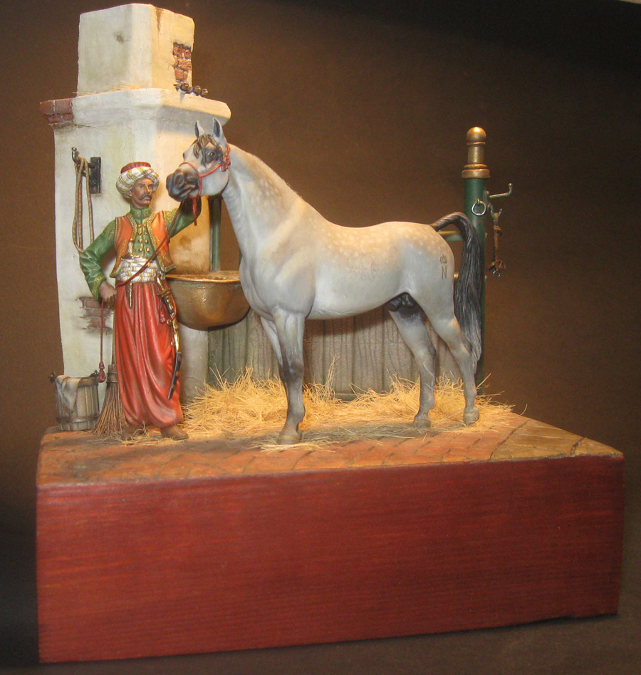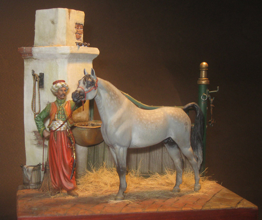 Начну с того что, эта работа делалась как подарок, как заказной подарок. По просьбе, теперь уже хозяина этой работы, главный персонаж в этой миниатюре конь арабской породы. Задача удачно пересеклась с моей любимой темой, с Наполеоникой. Выбор пал на фигурку от фирмы AMATI «Мамелюк 1801-1805 года» в масштабе 75мм, в металле. Это моя первая работа с этим масштабом.