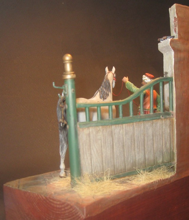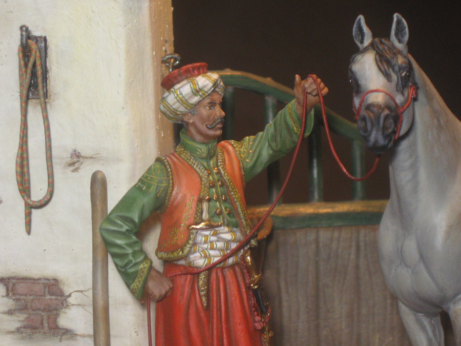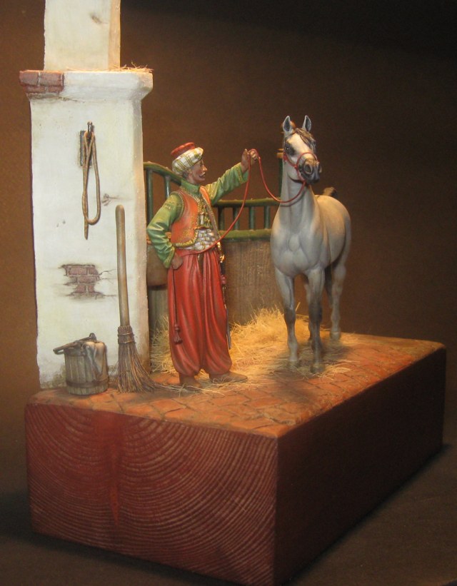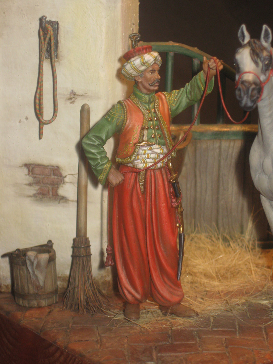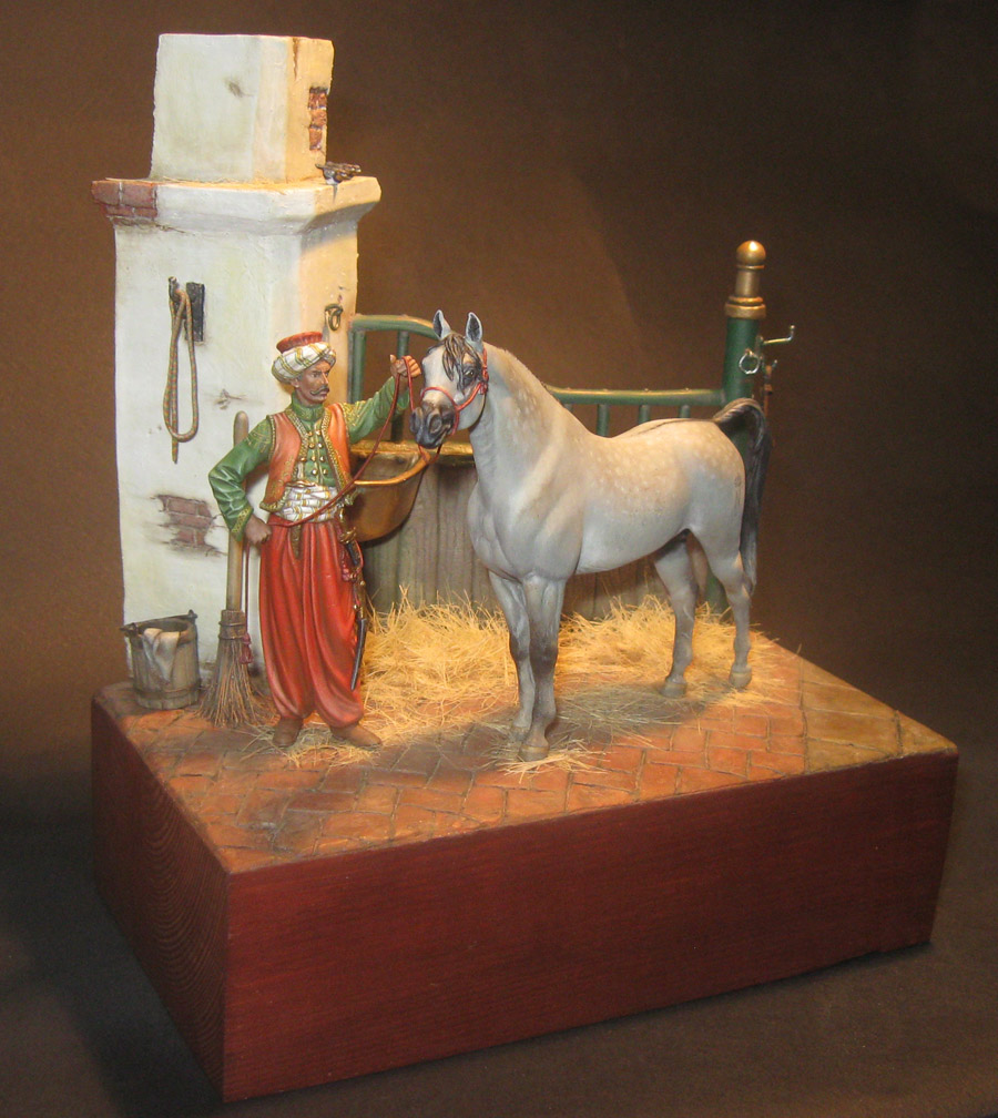Начну с того что, эта работа делалась как подарок, как заказной подарок. По просьбе, теперь уже хозяина этой работы, главный персонаж в этой миниатюре конь арабской породы. Задача удачно пересеклась с моей любимой темой, с Наполеоникой. Выбор пал на фигурку от фирмы AMATI «Мамелюк 1801-1805 года» в масштабе 75мм, в металле. Это моя первая работа с этим масштабом.