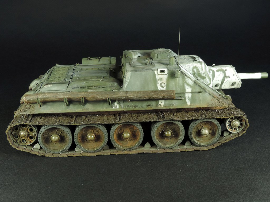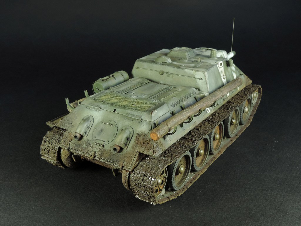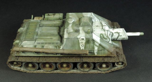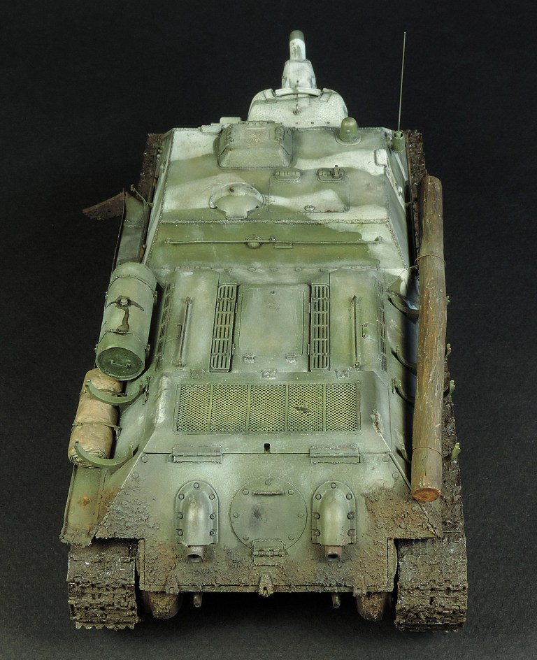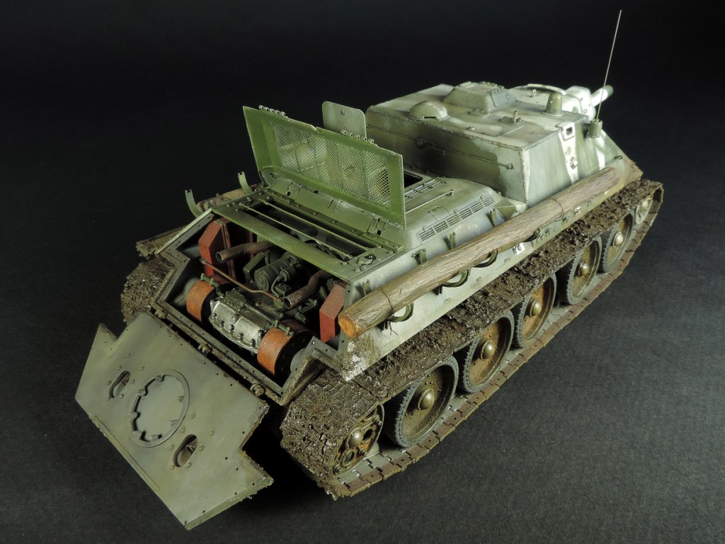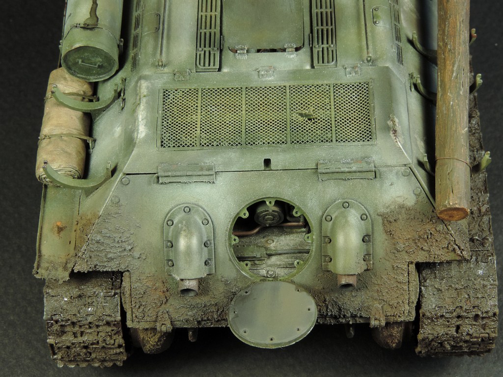 Так как был собран моторный отсек, пришлось сделать все люки и крышки на корме рабочими, но всё равно многого не видно. Не смог устоять и опять закидал самоходку грязью, по задумке это ранняя весна, распутица. Конечно на подставке она смотрелась бы на много удачнее, но в планах её не было изначально.